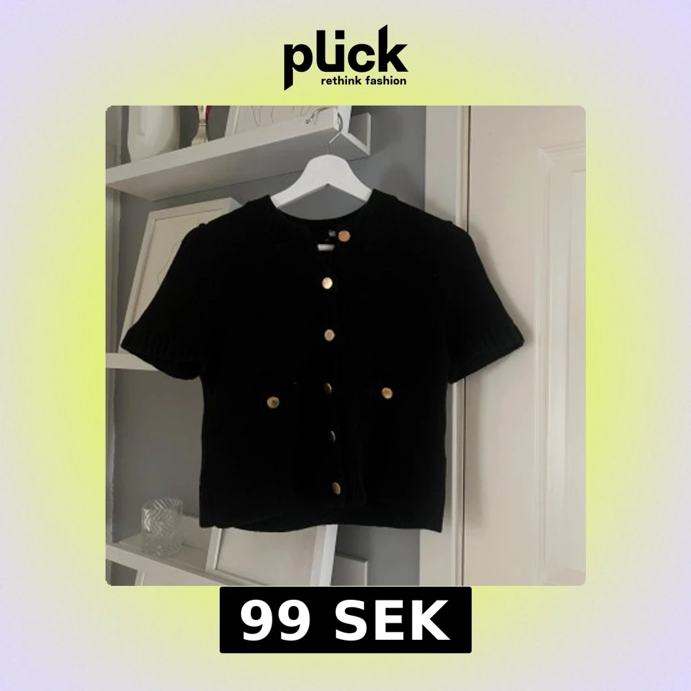 Kortärmad svart stickad kofta med rund hals och dekorativa guldknappar framtill. Två små fickor framtill. Perfekt att styla över en topp eller klänning.