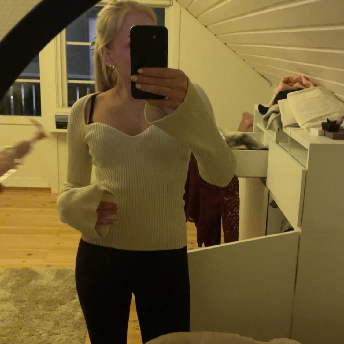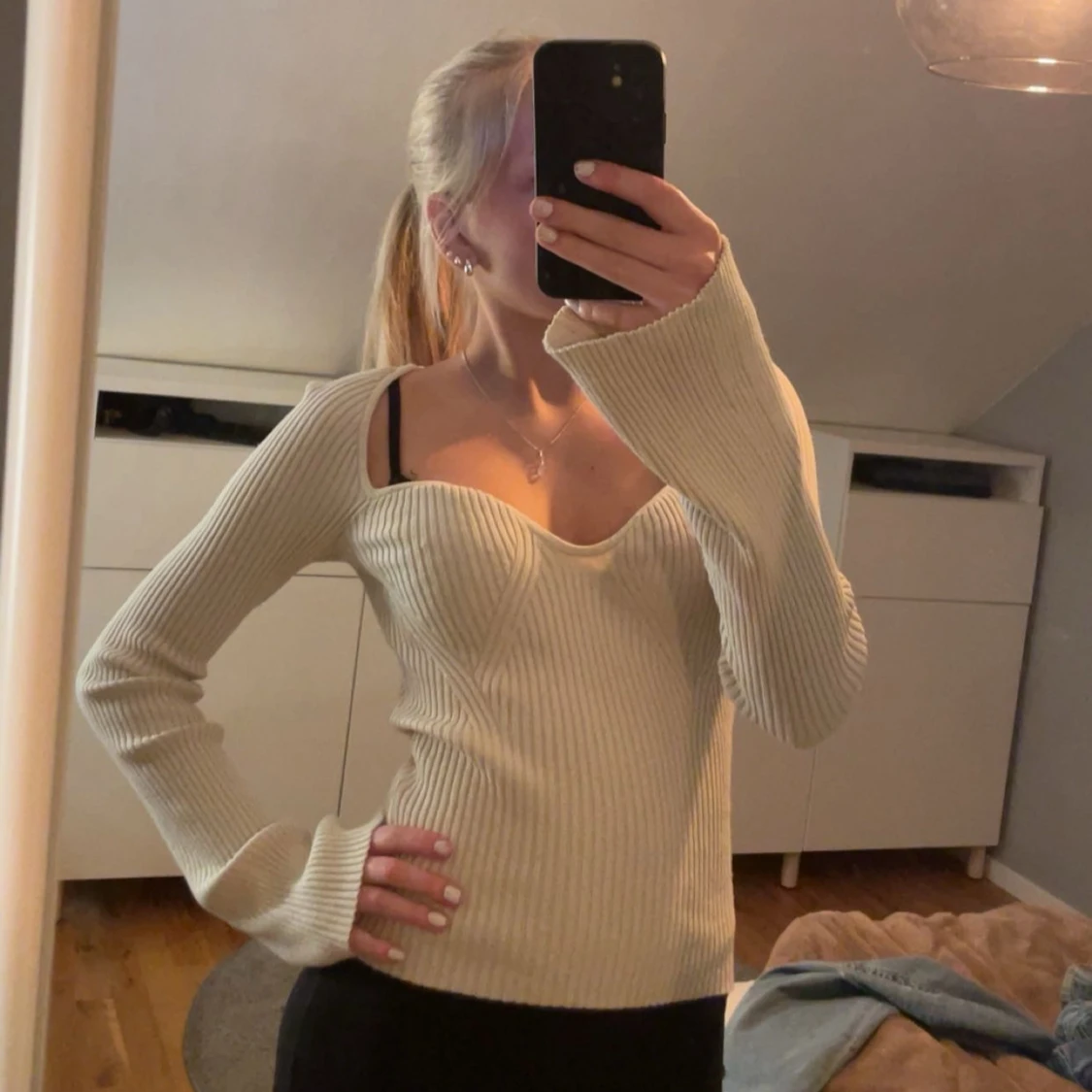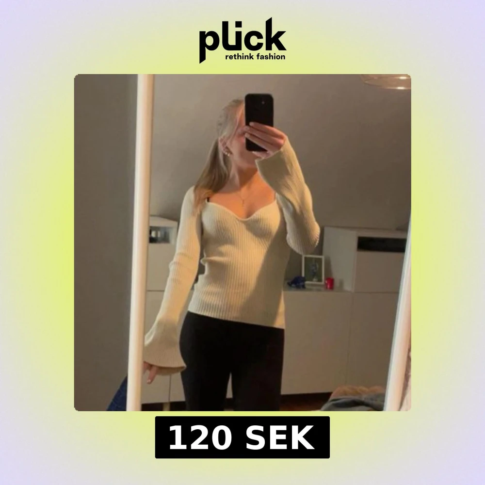 Säljer en stilren beige ribbad tröja med v-ringad design. Tröjan har långa ärmar och en figurnära passform och sitter väldigt fint. Skriv för fler bilder🌸Den är kremevit i färgen