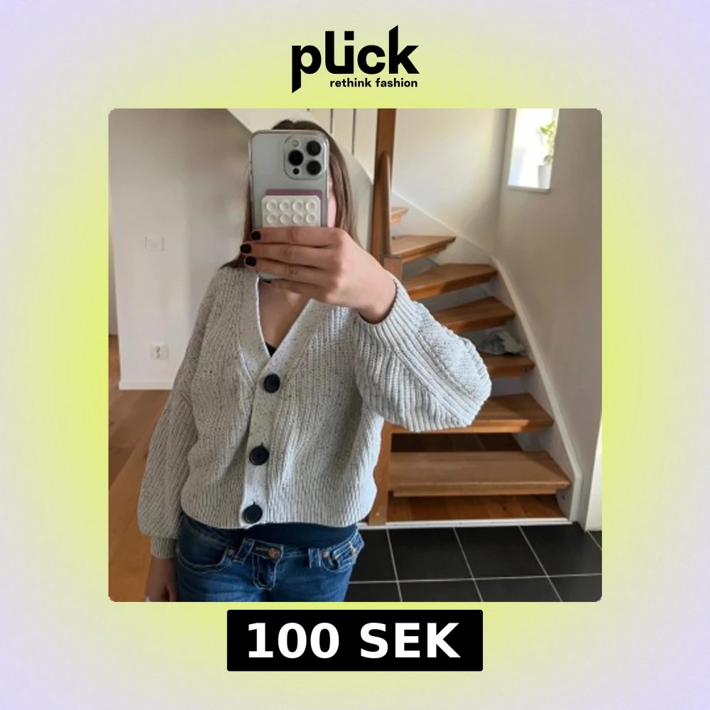 Supermysig ljusgrå stickad kofta från H&M med stora svarta knappar och ribbade muddar. Koftan är croppad och har en loose fit med långa ärmar. Perfekt att slänga över ett linne för en chill look.