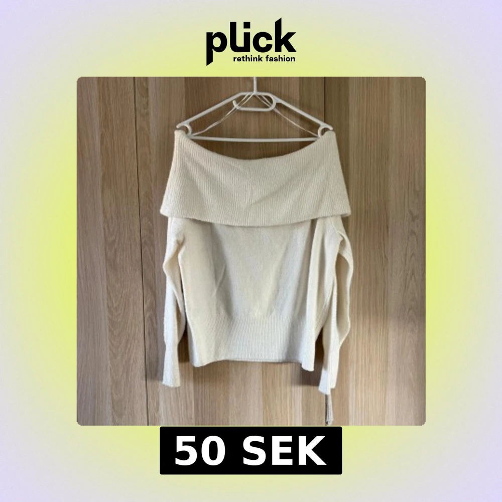 Krämvit stickad tröja från H&M i offshoulder-modell med bred, ribbad krage. Långärmad och mjuk, perfekt för lager-på-lager under höst och vinter. Snygg och enkel att styla med jeans eller kjol.