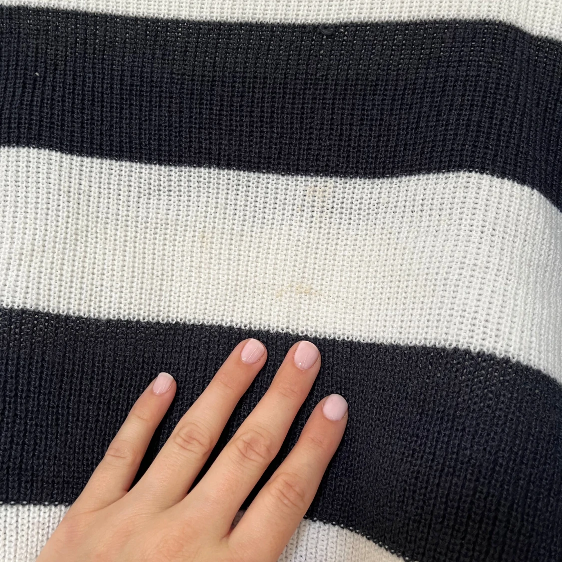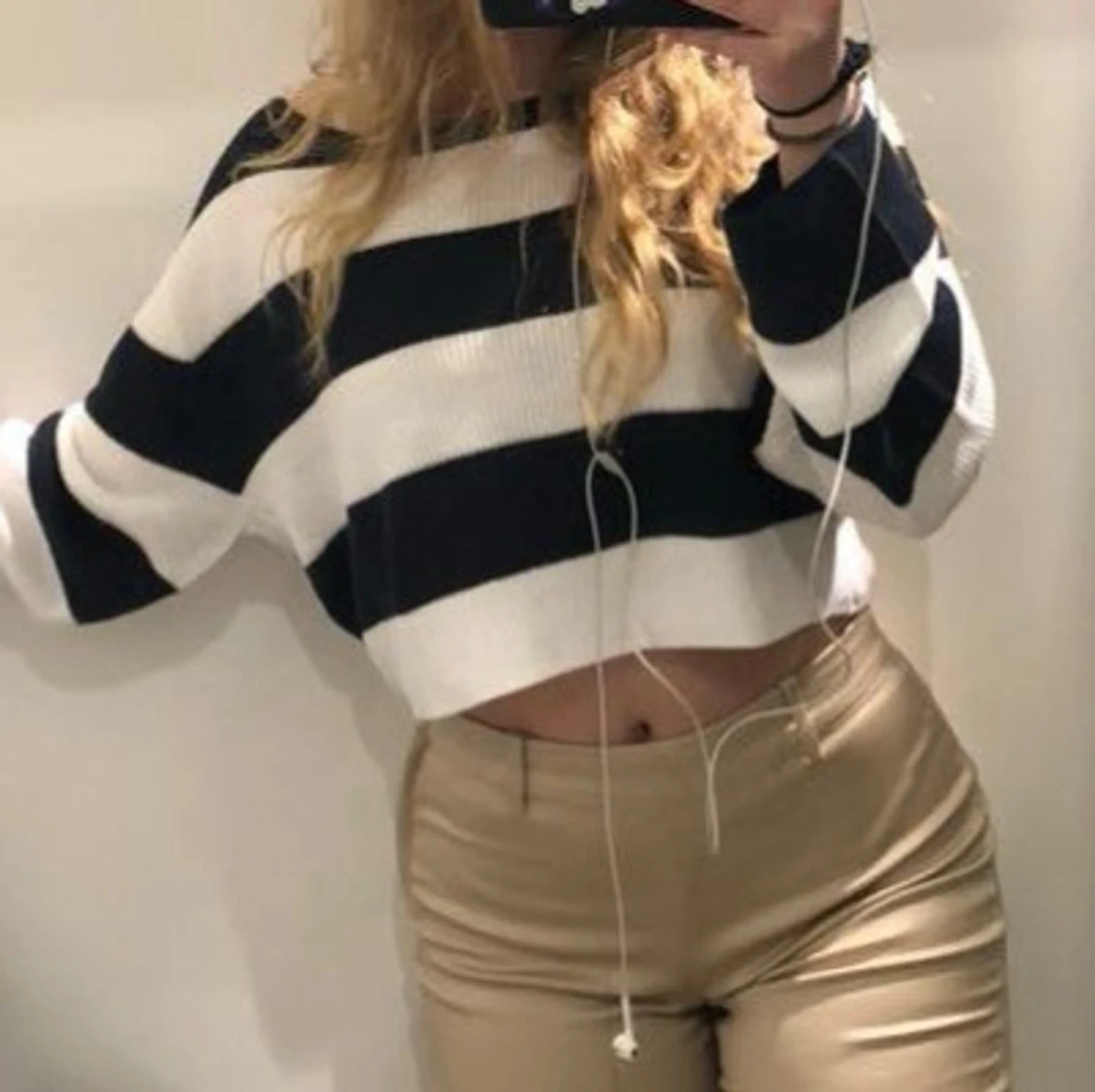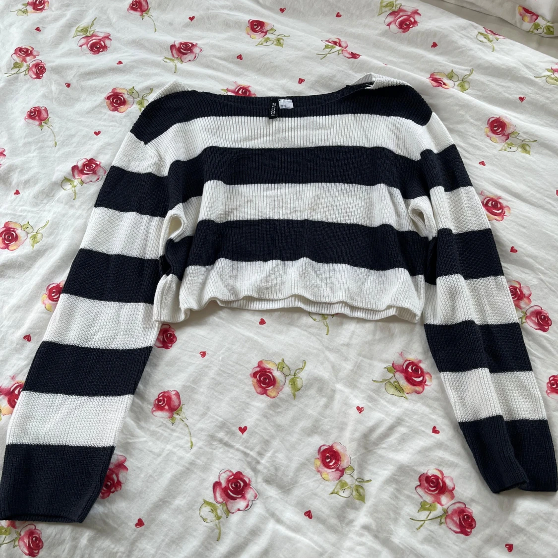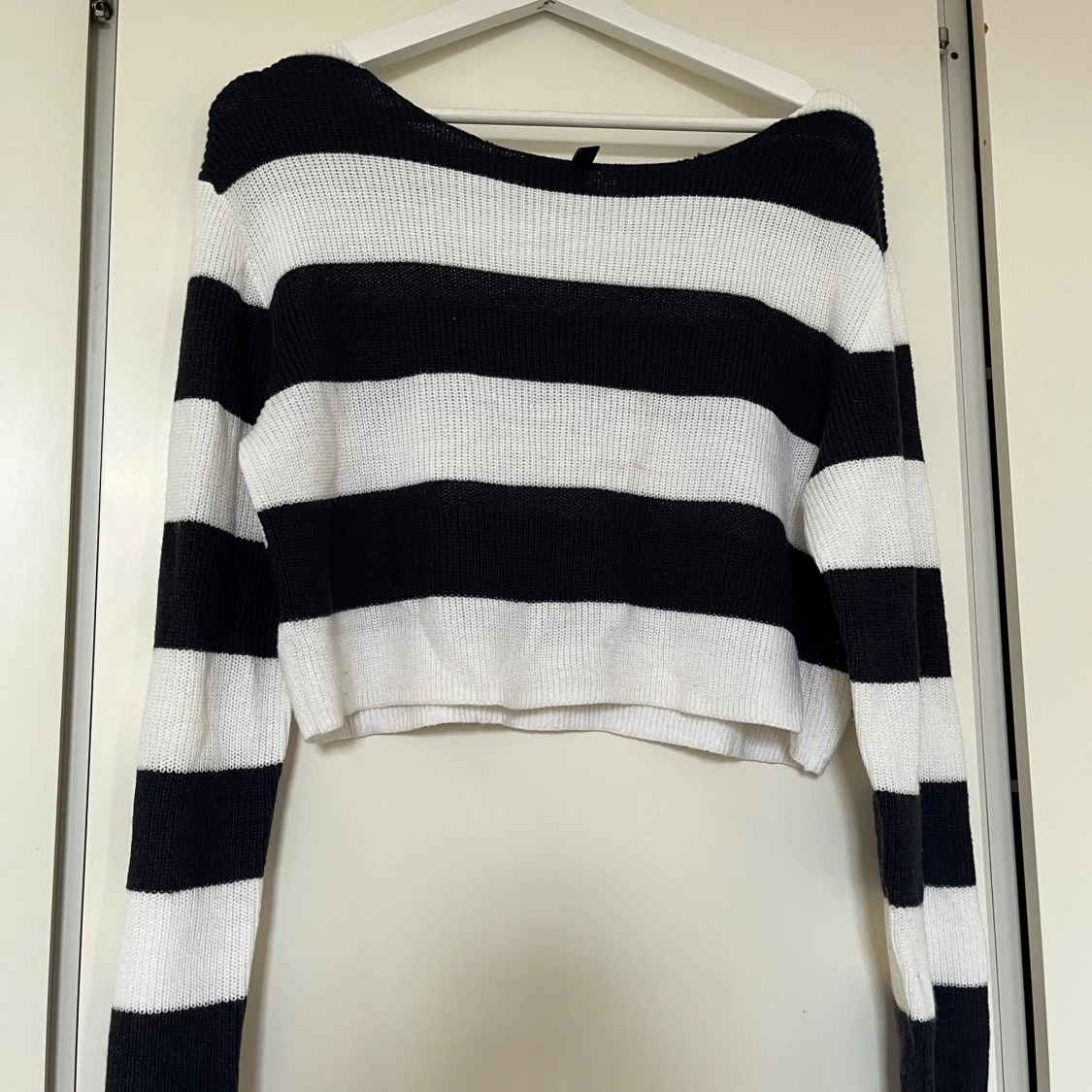 Stickad randig croppad långärmad tröja från HM i storlek XS. finns en liten fläck på framsidan, se bild.