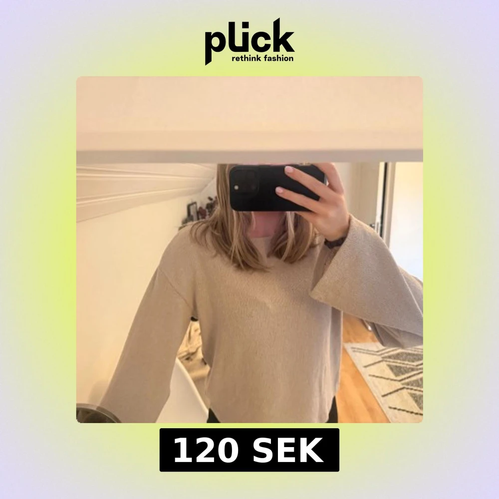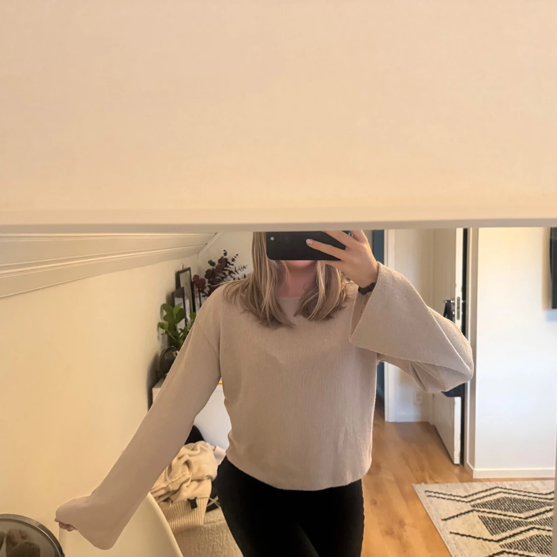 Säljer en beige långärmad tröja med riktigt schyssta vida ärmar och rak passform. Tröjan har en enkel rund halsringning och är gjord i ett mjukt material som känns skönt mot huden. Perfekt för dig som gillar stilrena och chill plagg.