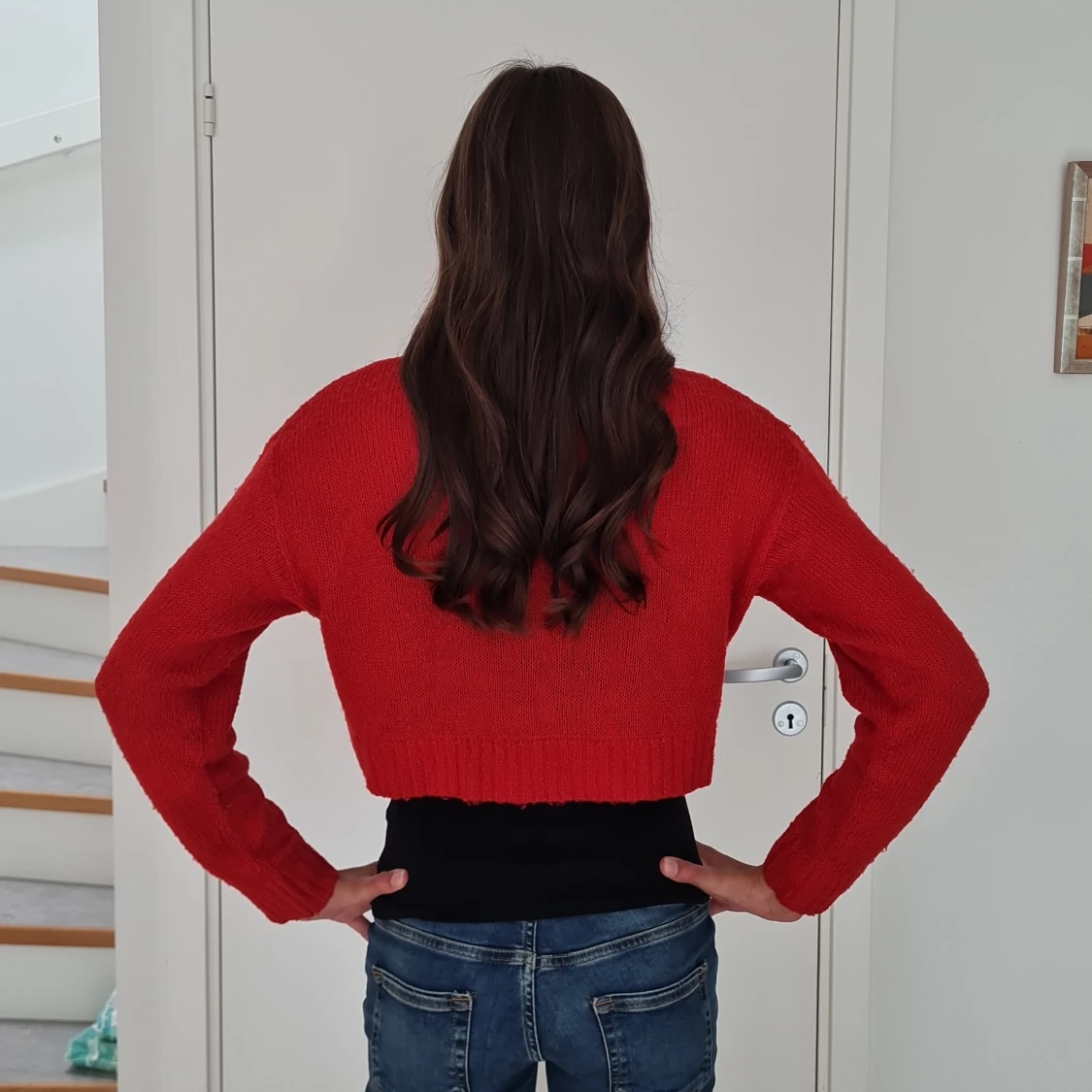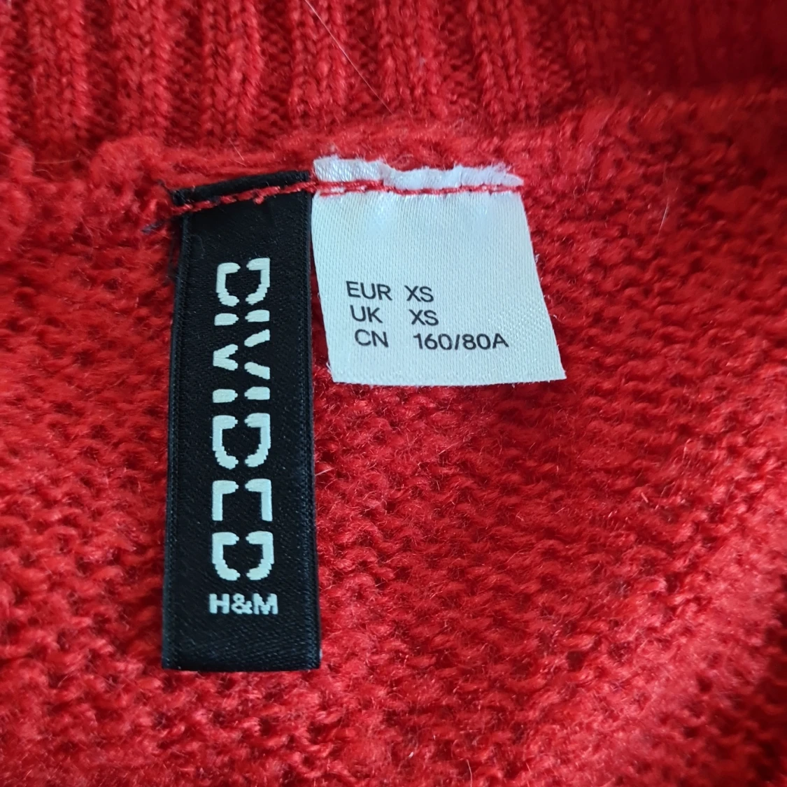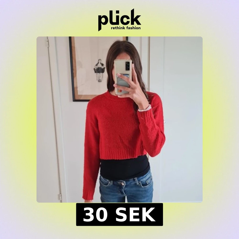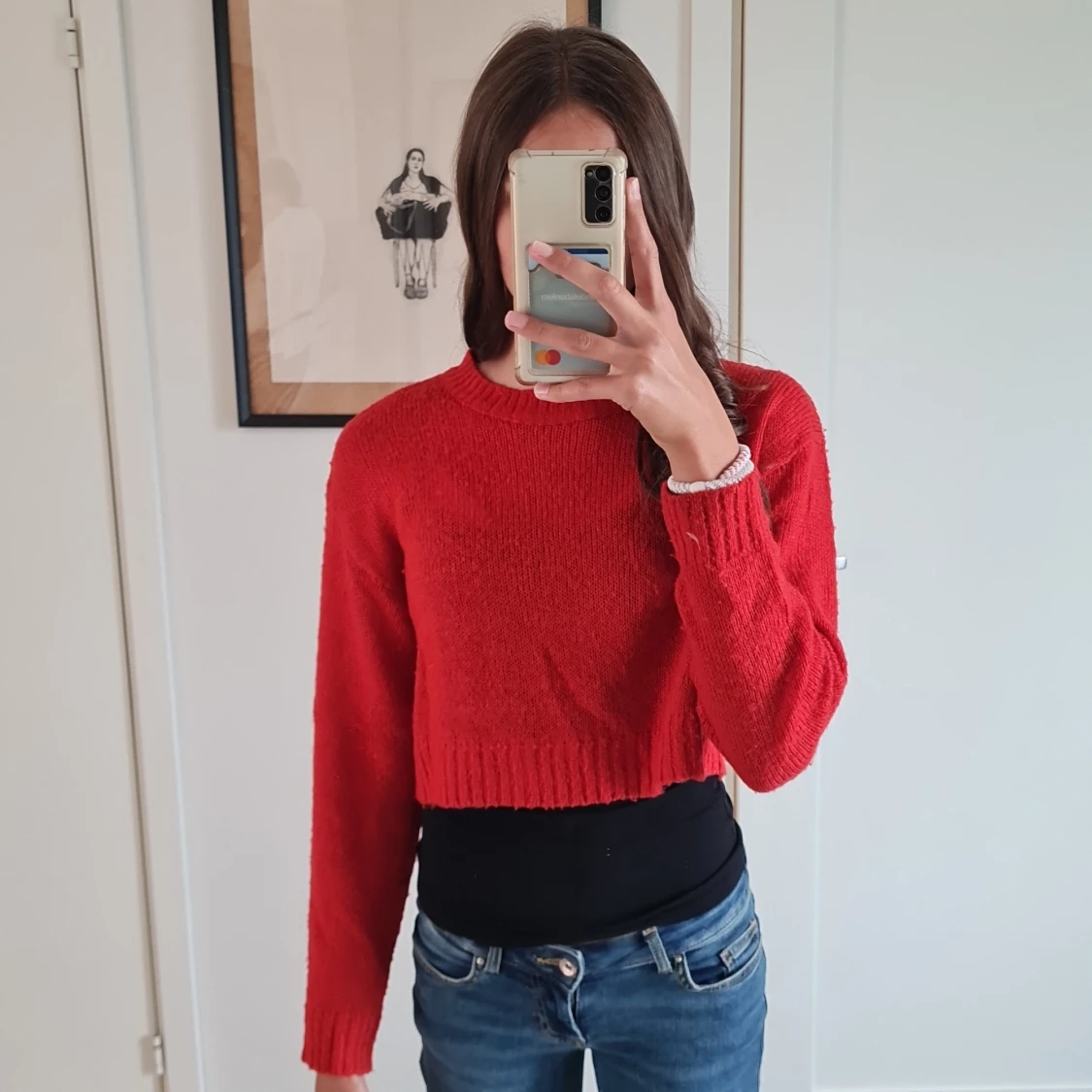 Säljer en röd croppad stickad tröja från H&M Divided i storlek XS. Tröjan har rund hals, långa ärmar och ribbade muddar vid ärmslut och nederkant.