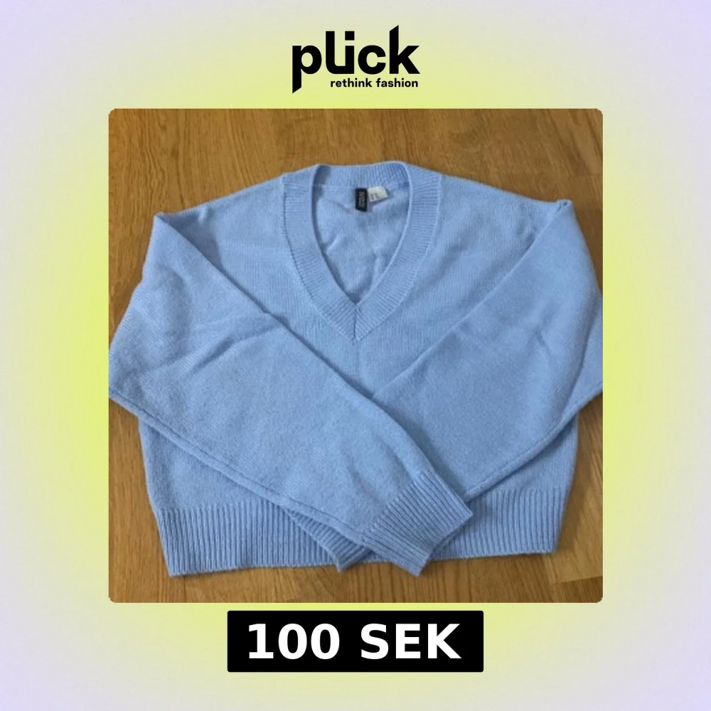 Säljer en ljusblå stickad tröja från H&M Divided. Tröjan har en v-ringad hals och långa ärmar med ribbade muddar. Säljer för att jag inte andvönder längre