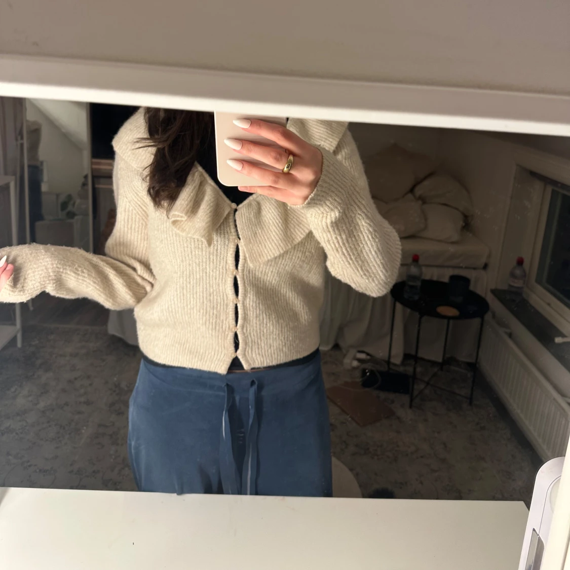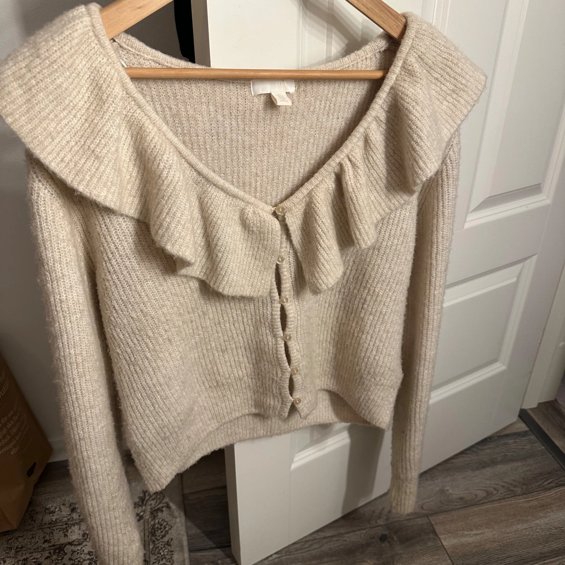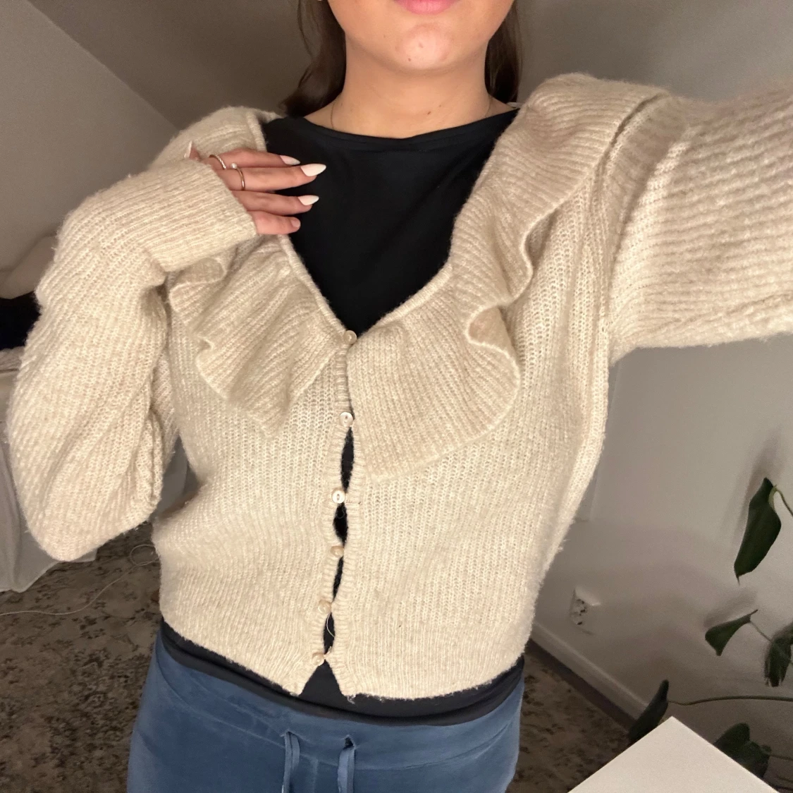 Säljer en mysig beige kofta med volangdetalj längs halsringningen. Koftan har långa ärmar och knappar framtill. Perfekt för en stilren och bekväm look.