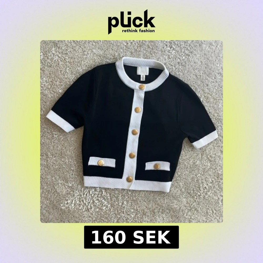 Stilren svart kofta från H&M i storlek XS med korta ärmar, vita ribbade kanter och dekorativa guldknappar framtill. Falska fickor med vita detaljer och guldknappar ger en lyxig känsla. Perfekt för dig som gillar klassisk och trendig stil. Använda endas ett fåtal gånger!!
