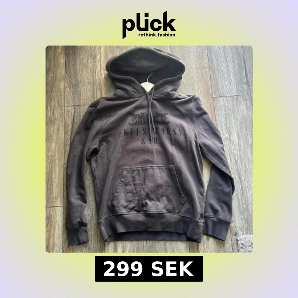 Säljer en mörkgrå hoodie från Levi's med tryck framtill och klassisk känguruficka. Tröjan har huva med dragsko och ribbade muddar vid ärmslut och nederkant. Perfekt för en avslappnad stil.