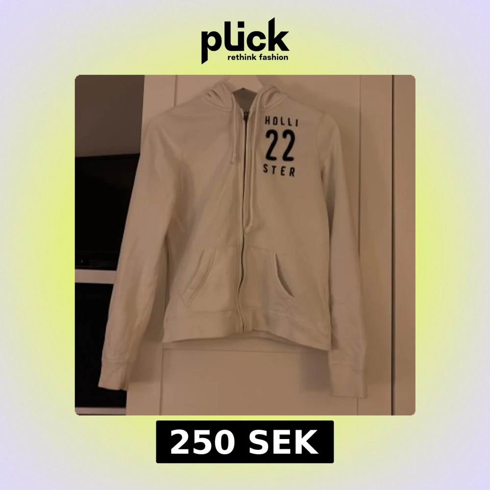 Säljer en vit hoodie från Hollister med dragkedja och tryck 'Hollister 22' på bröstet. Den har en mysig huva och praktiska fickor framtill. Perfekt för en avslappnad stil.