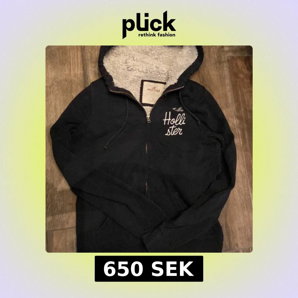 Mysig marinblå hoodie från Hollister med fluffigt vitt foder i huvan. Tröjan har dragkedja, snörning vid huvan och broderad logga på bröstet. Perfekt för kyliga dagar och har praktiska fickor framtill.