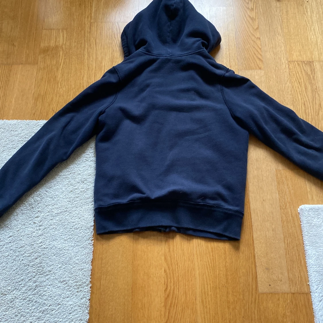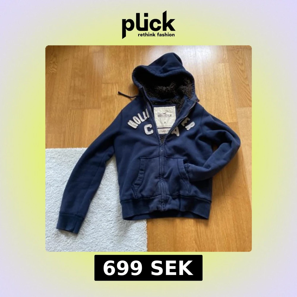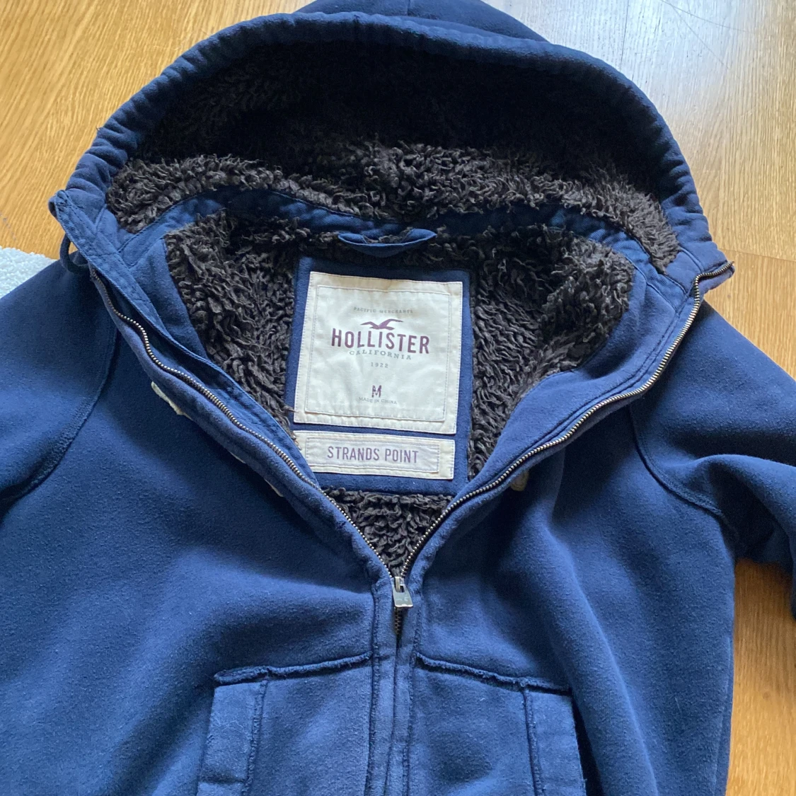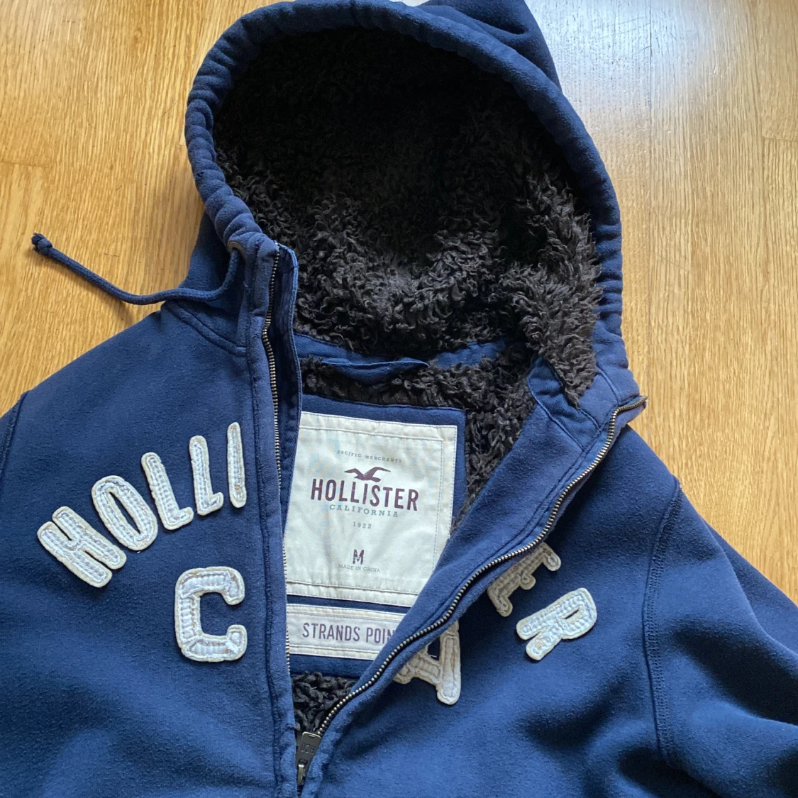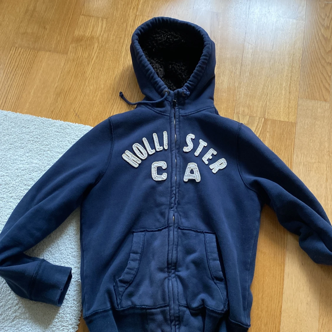 Mysig mörkblå hoodie från Hollister med broderad text på bröstet. Tröjan har dragkedja, huva med snörning och fluffigt mörkbrunt foder på insidan. Två fickor framtill och ribbade muddar vid ärmslut och nederkant. Perfekt för kyliga dagar. Storlek M, har tecken på användning