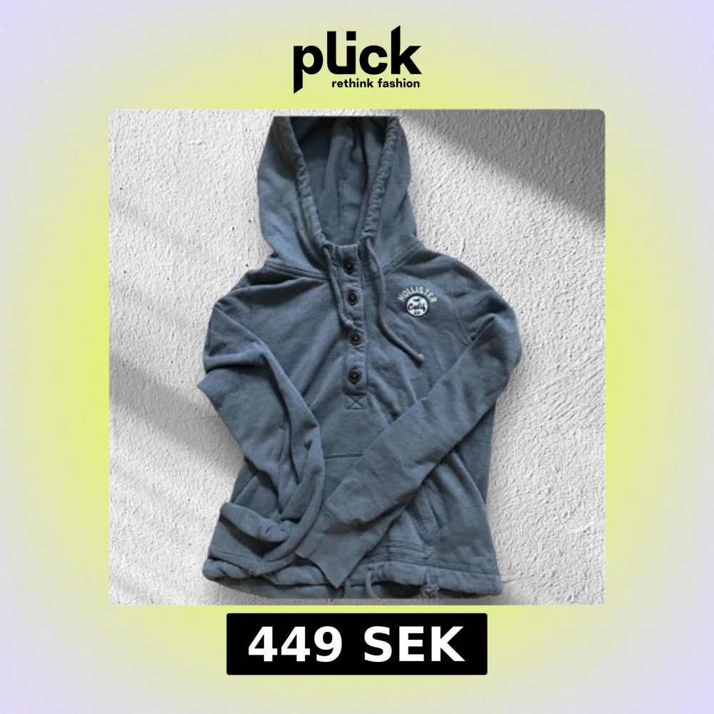 Säljer en grå hoodie från Hollister med broderad logga på bröstet. Tröjan har huva med snörning, fyra svarta knappar framtill och långa ärmar. Mjuk bomullskänsla och fickor på sidorna. Perfekt för chill dagar och enkel att matcha.
