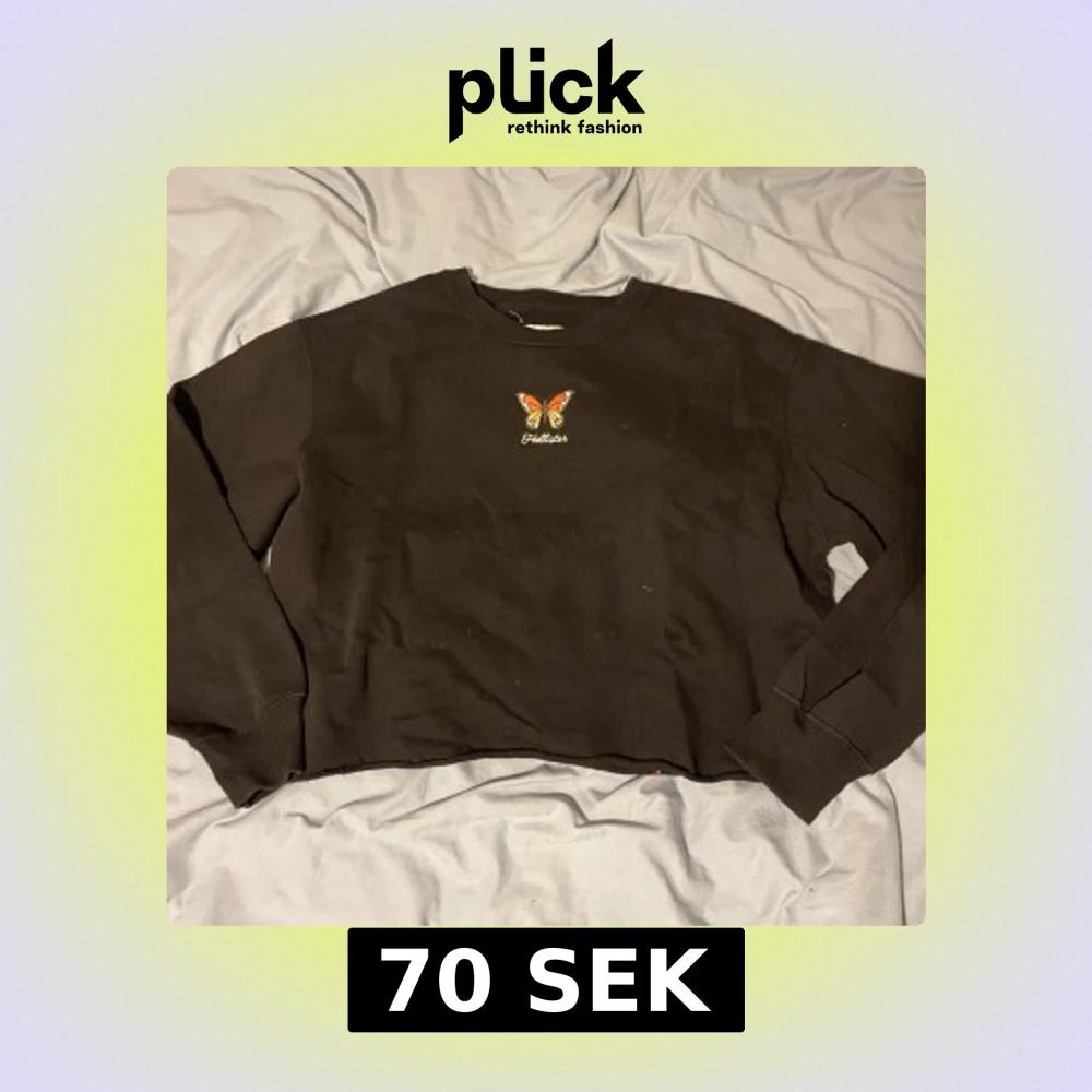Svart croppad sweatshirt från Hollister med broderad fjäril i orange och gul på bröstet samt Hollister-logga under. Tröjan har rund hals, långa ärmar och ribbade muddar. Perfekt för dig som gillar chill och snygg streetstil.