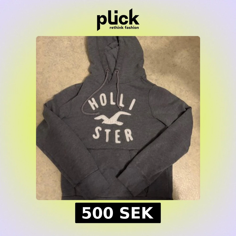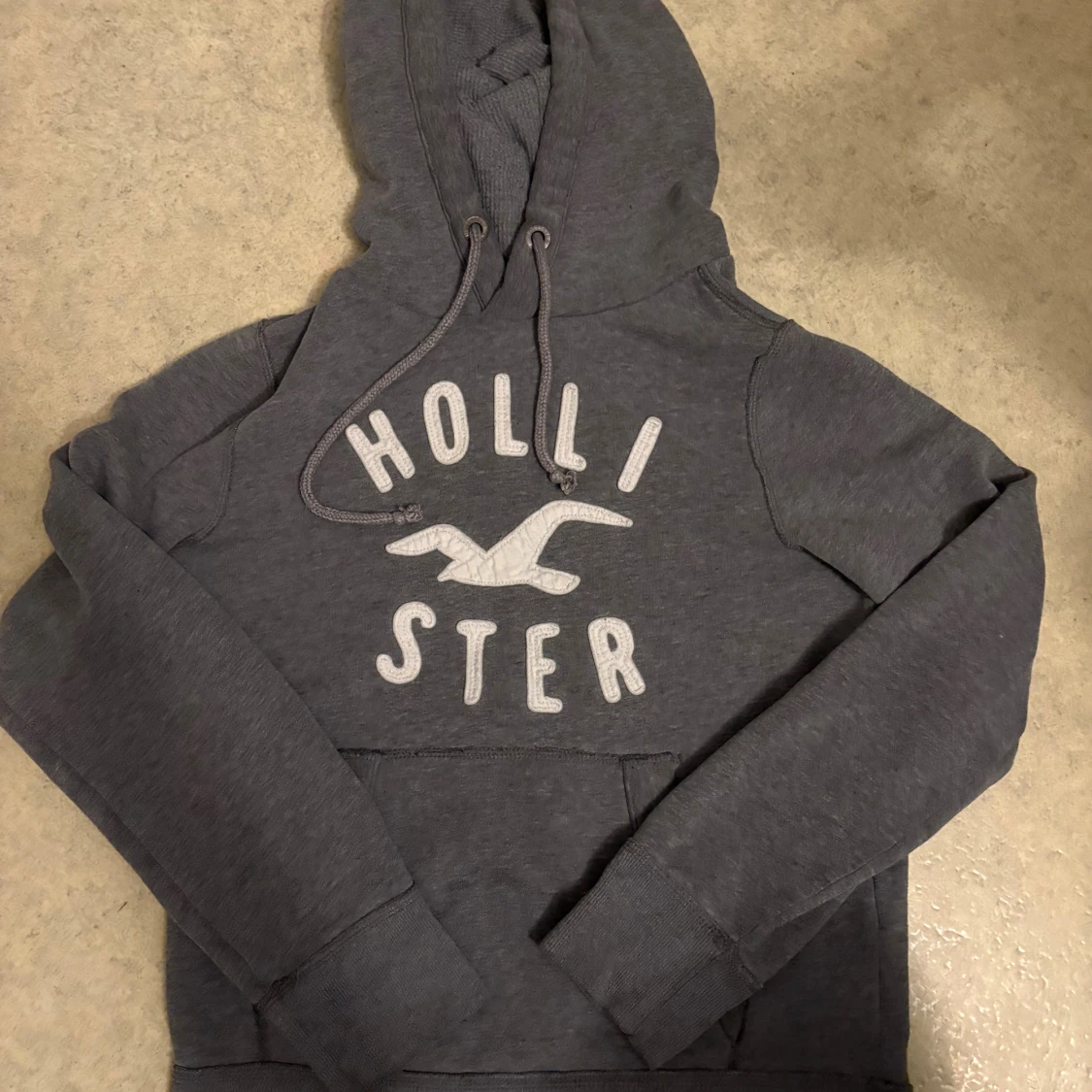 Snygg mörkgrå hoodie från Hollister med stor logga och fågeltryck på bröstet. Tröjan har huva med snörning, magficka och långa ärmar. Perfekt för chill dagar och enkel att matcha med jeans eller joggers. Lite sliten