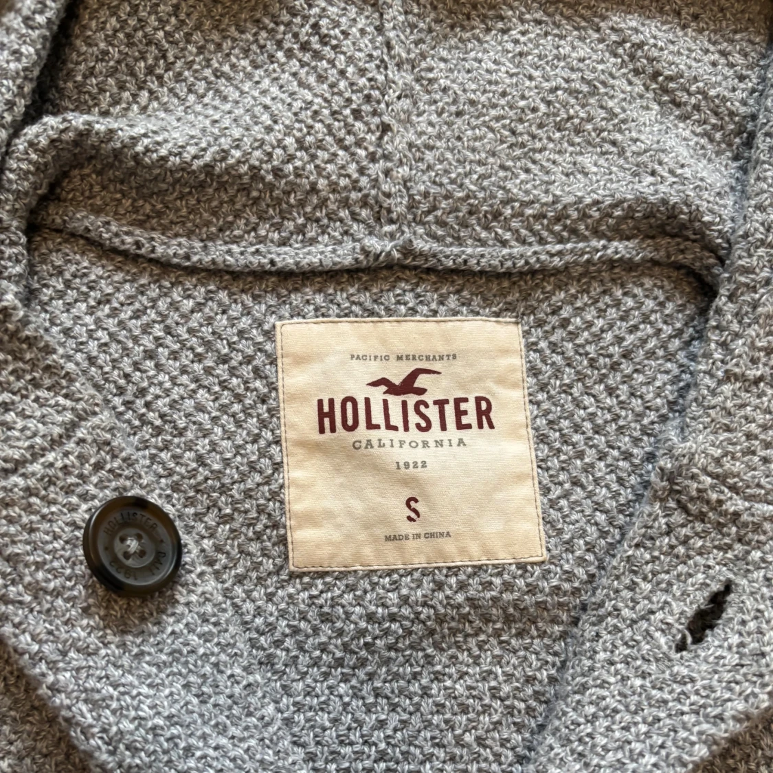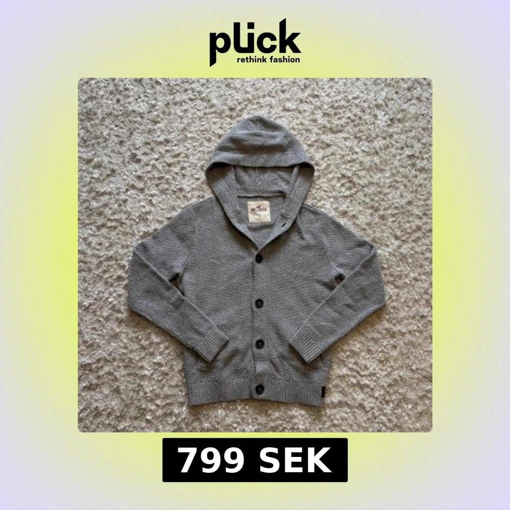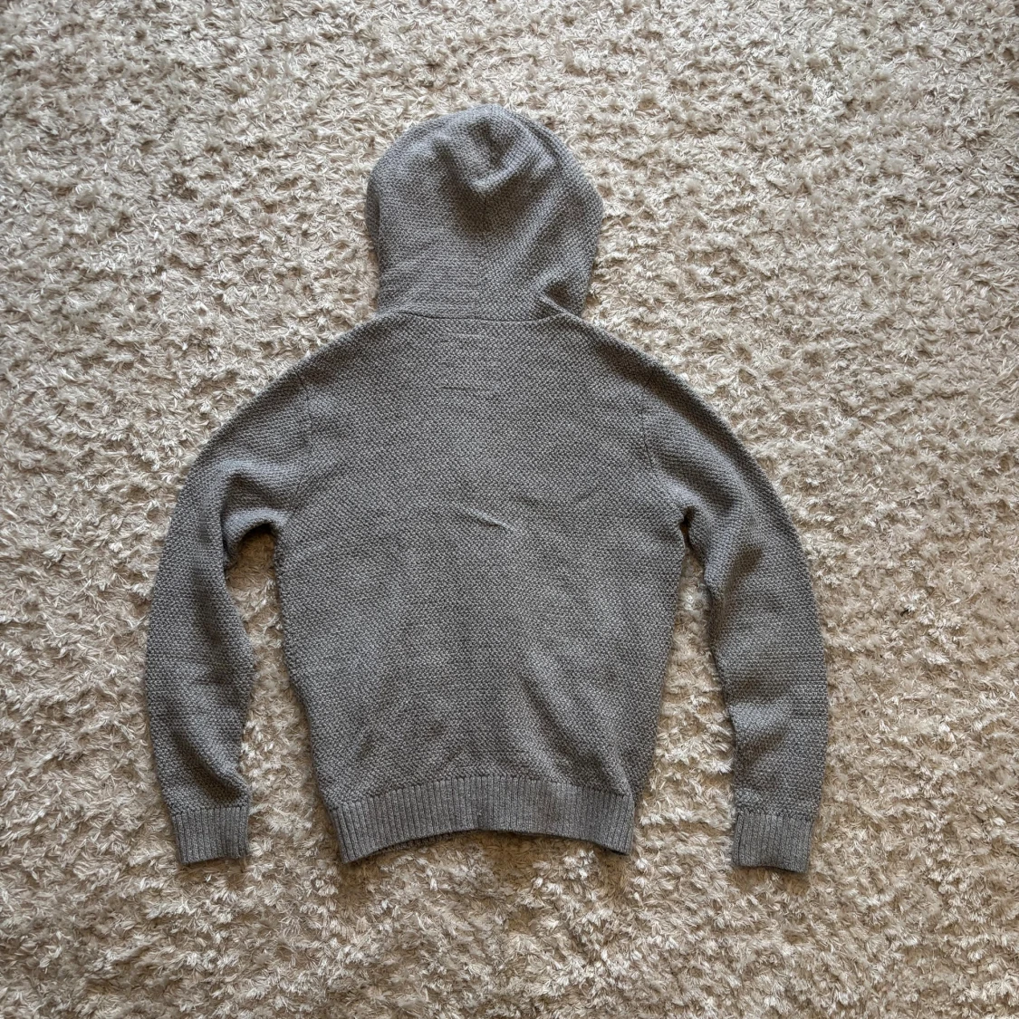 Snygg grå stickad kofta/hoodie från Hollister med knappar framtill. Den är använd men i mycket gott skick utan fläckar eller hål. Storlek S, tveka inte o skriva vid fler frågor!