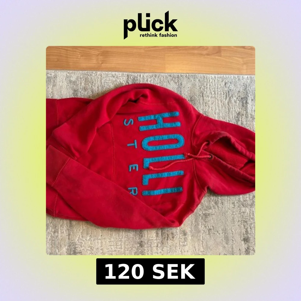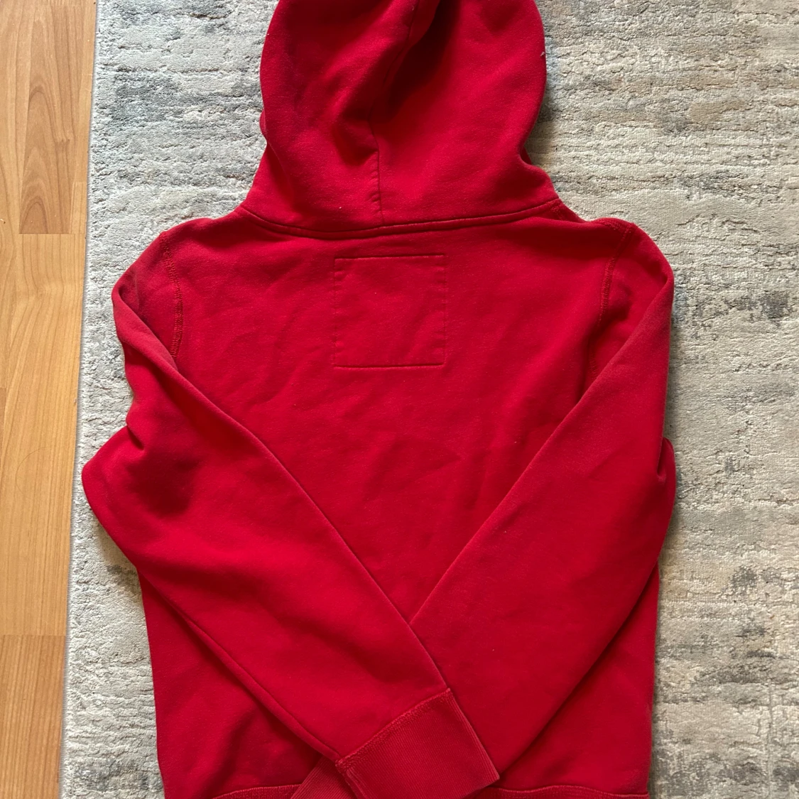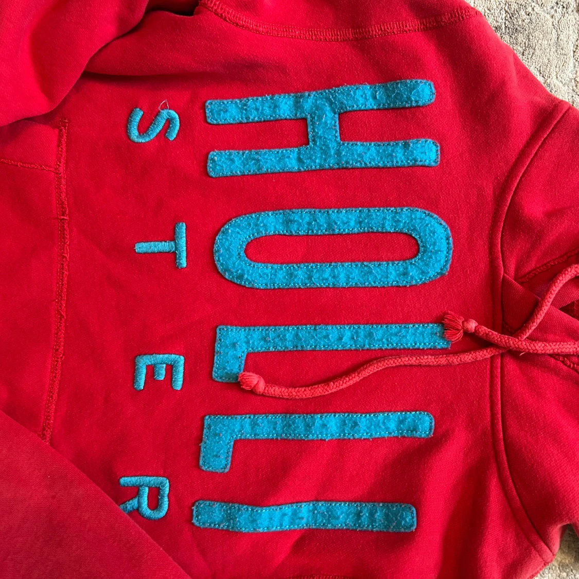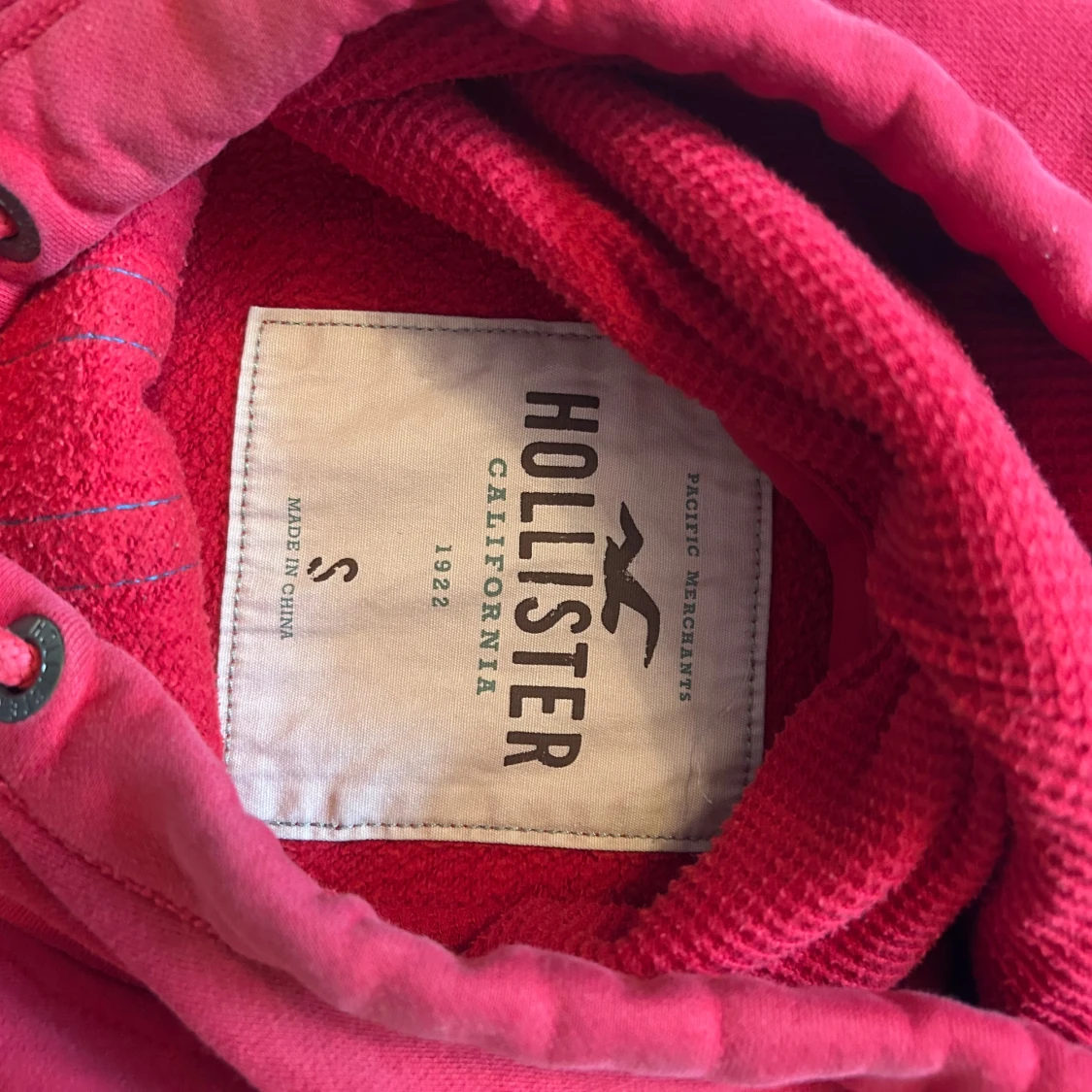 Röd hoodie från Hollister med stor blå broderad logga framtill. Klassisk känguruficka, dragsko i huvan och mjukt bomullsmaterial. Perfekt för dig som gillar en chill och sportig stil. Långärmad och normal passform.