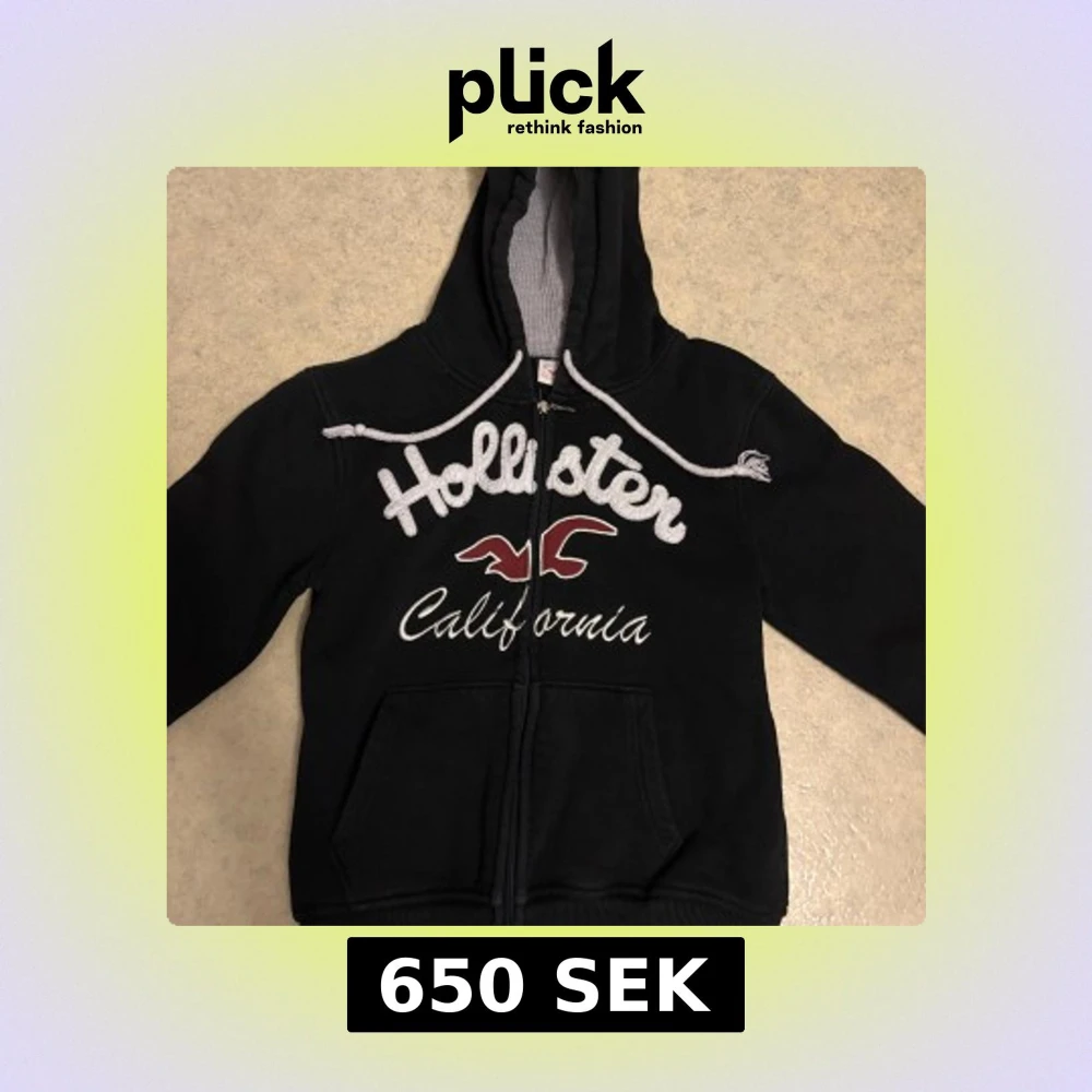 Svart hoodie från Hollister med stor broderad logga och text på bröstet. Tröjan har huva med grått foder, vita snören och praktiska fickor framtill. Stängs med dragkedja och har långa ärmar. Perfekt för chill dagar och streetstyle. Storlek M men passar S