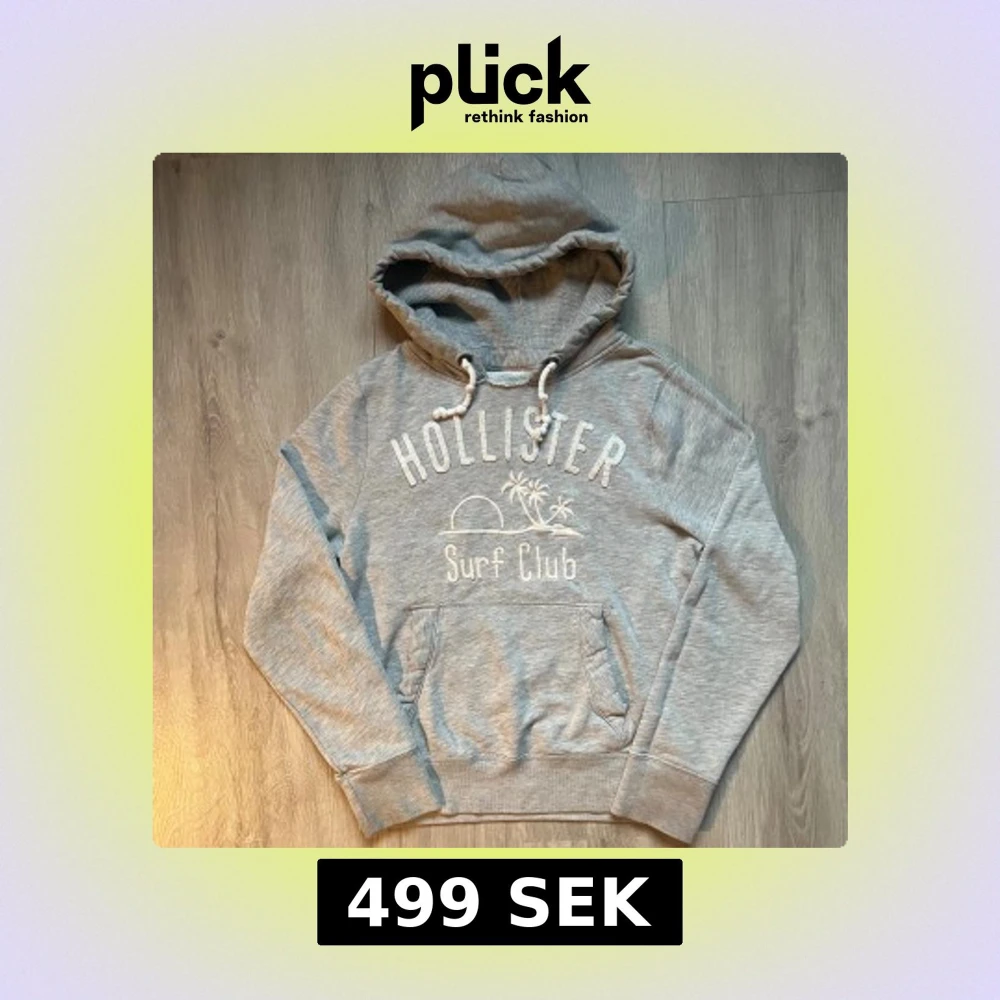 Säljer en grå hoodie från Hollister med vit broderad text och palmtryck på bröstet. Tröjan har huva med snörning, magficka och ribbade muddar. Perfekt för chill dagar och har en mjuk insida i bomullsmix. Klassisk surf club-stil.