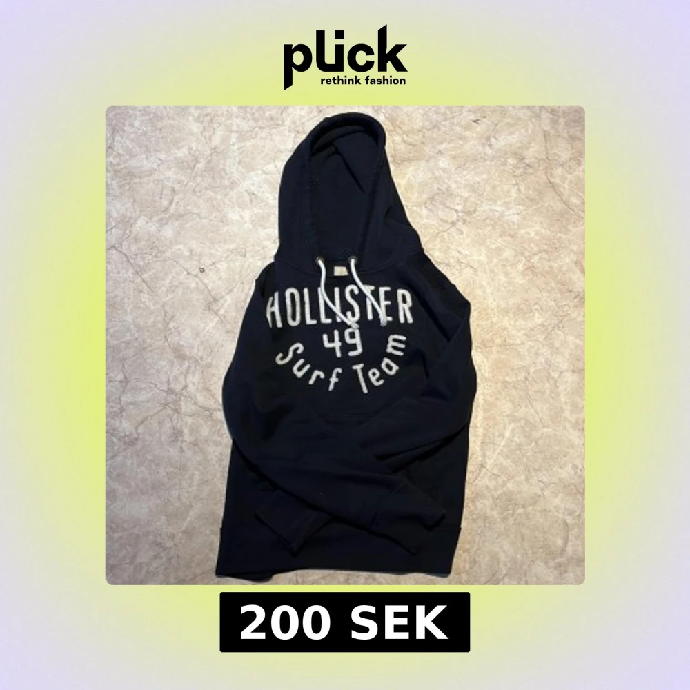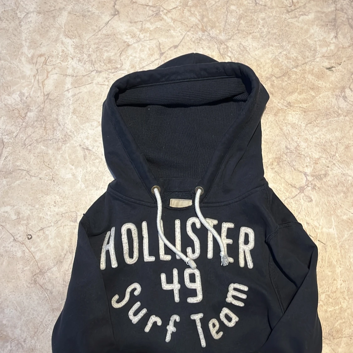 Säljer en svart hoodie från Hollister med texten 'Hollister 49 Surf Team' på framsidan. Den har en klassisk känguruficka och justerbar huva med snören. Perfekt för en avslappnad stil. Säljer pga för liten för mig. Hoodien är riktigt skön och snygg.