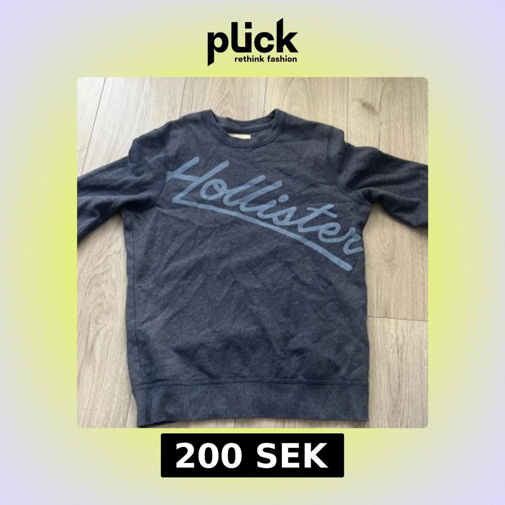 Säljer en snygg mörkgrå tröja från Hollister med deras logga i stort tryck över bröstet. Tröjan har långa ärmar och en klassisk rund halsringning. Perfekt för en avslappnad stil.