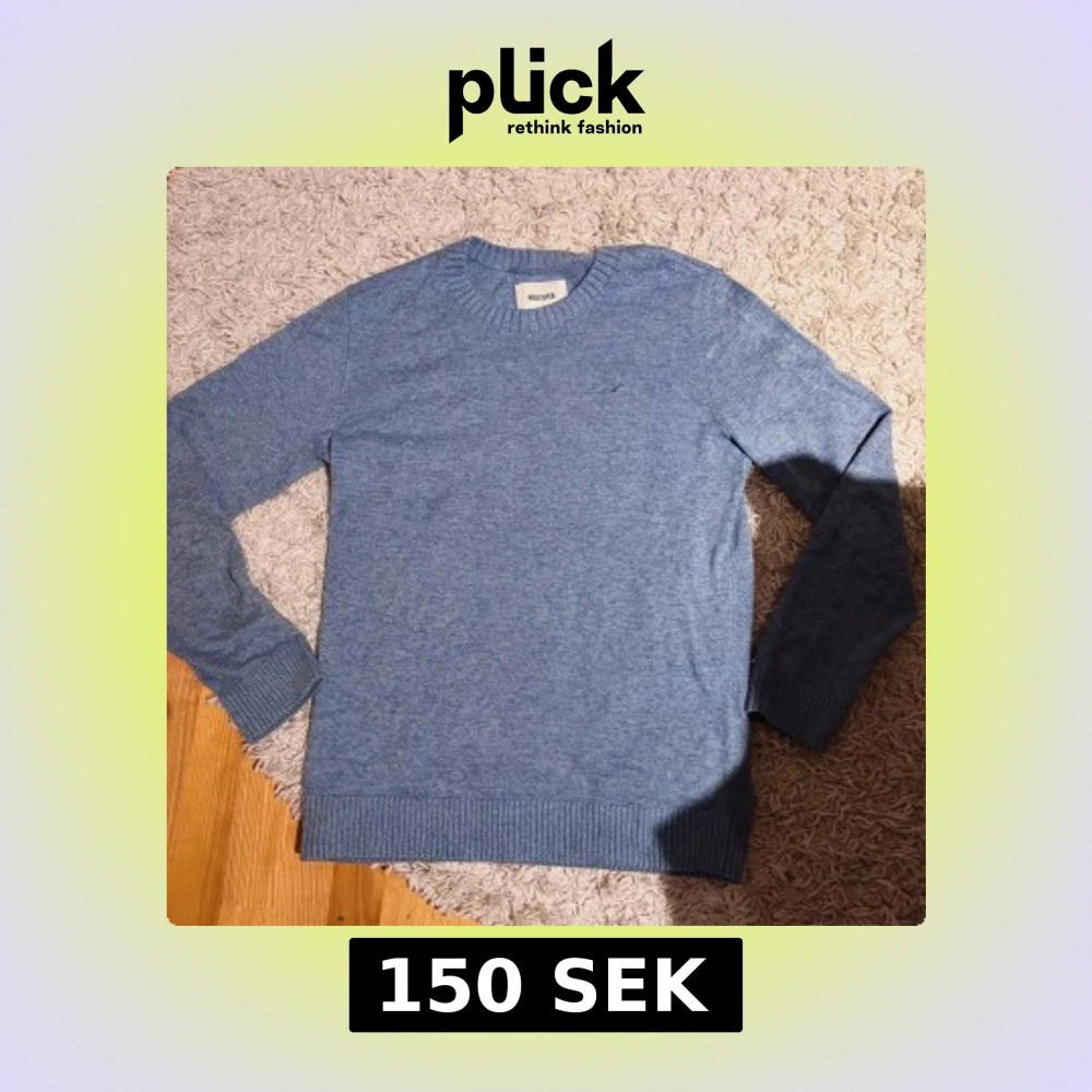 Snygg ljusblå (MER ljusblå IRL) stickad tröja från Hollister i storlek S, men jag som vanligt vis har medium och är 183cm kan ha den eftersom det är mjukt och relativt stretchigt material. Tröjan har rund halsringning och en diskret logga på bröstet. Perfekt för allt mellan vanliga, uppklädda vardagar till ”finare tillställningar” hör av dig vid minsta fråga!