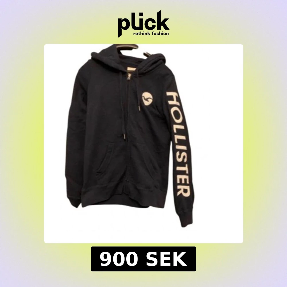 Svart hoodie från Hollister med dragkedja, huva och stora vita bokstäver längs ena ärmen. Klassisk logga på bröstet och tryckt detalj på huvan. Perfekt för en chill och avslappnad stil.