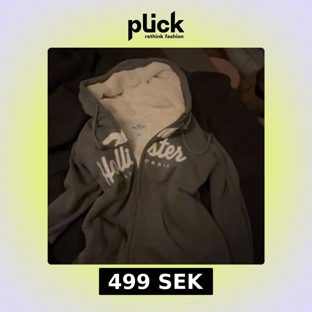 Mysig grå hoodie från Hollister med fluffigt vitt foder på insidan och stor vit logga på bröstet. Tröjan har huva med snörning och dragkedja framtill. Perfekt för kalla dagar när du vill vara både chill och varm.