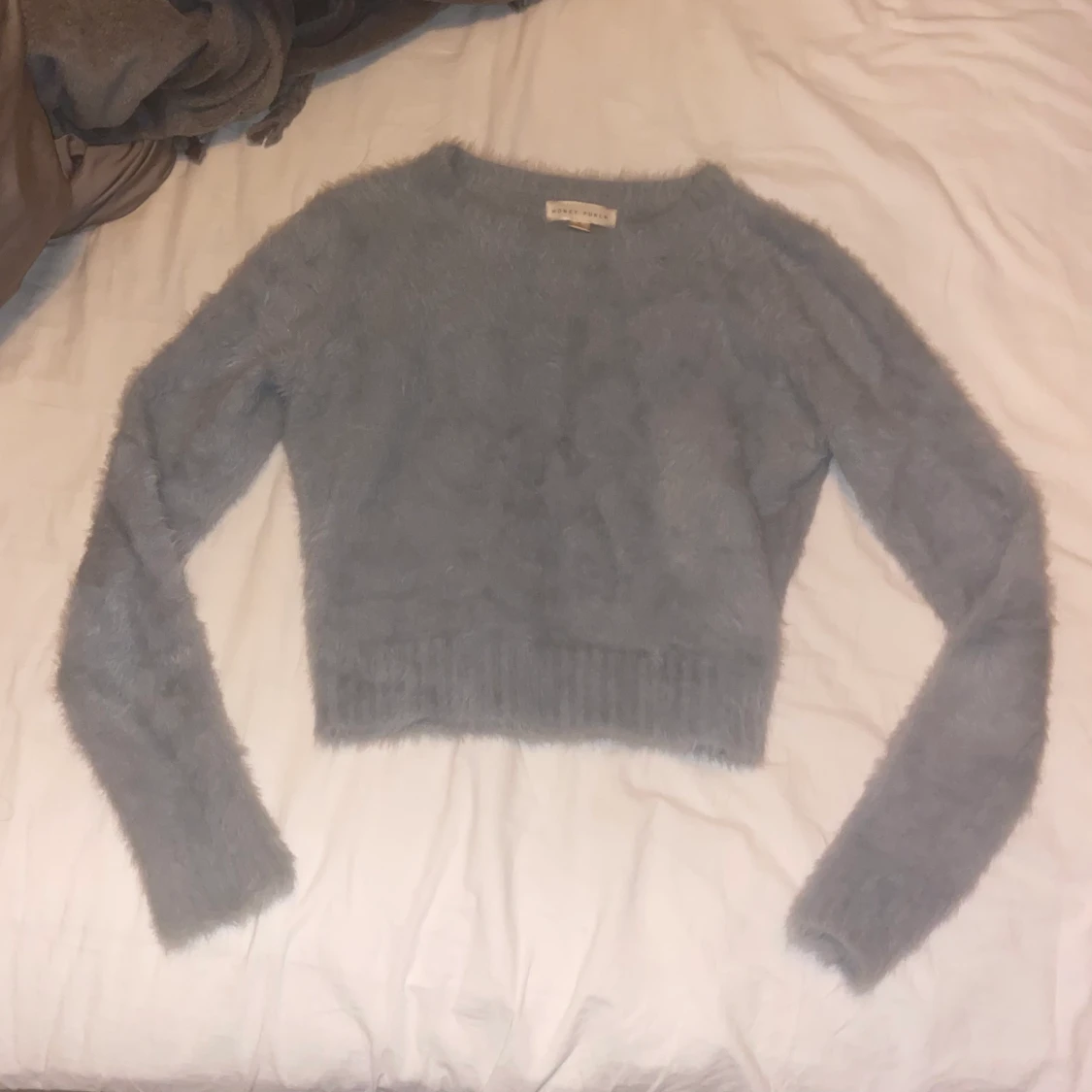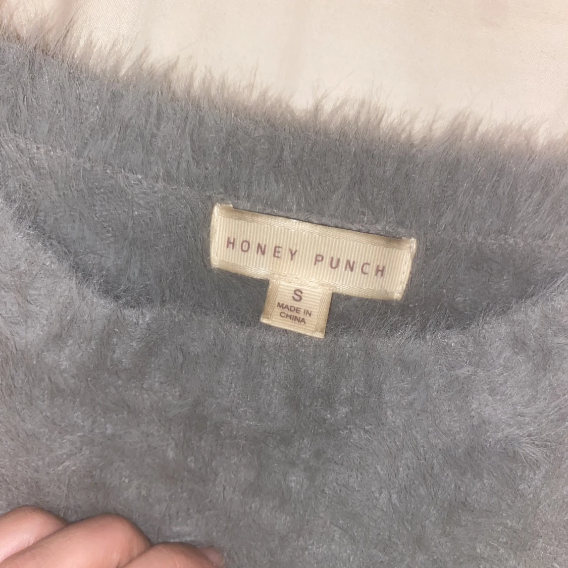 Såå mjuk och mysig tröja från Honey Punch. Den är fuzzy inuti också. I väldigt fint skick. Gröngrå färg Storlek S