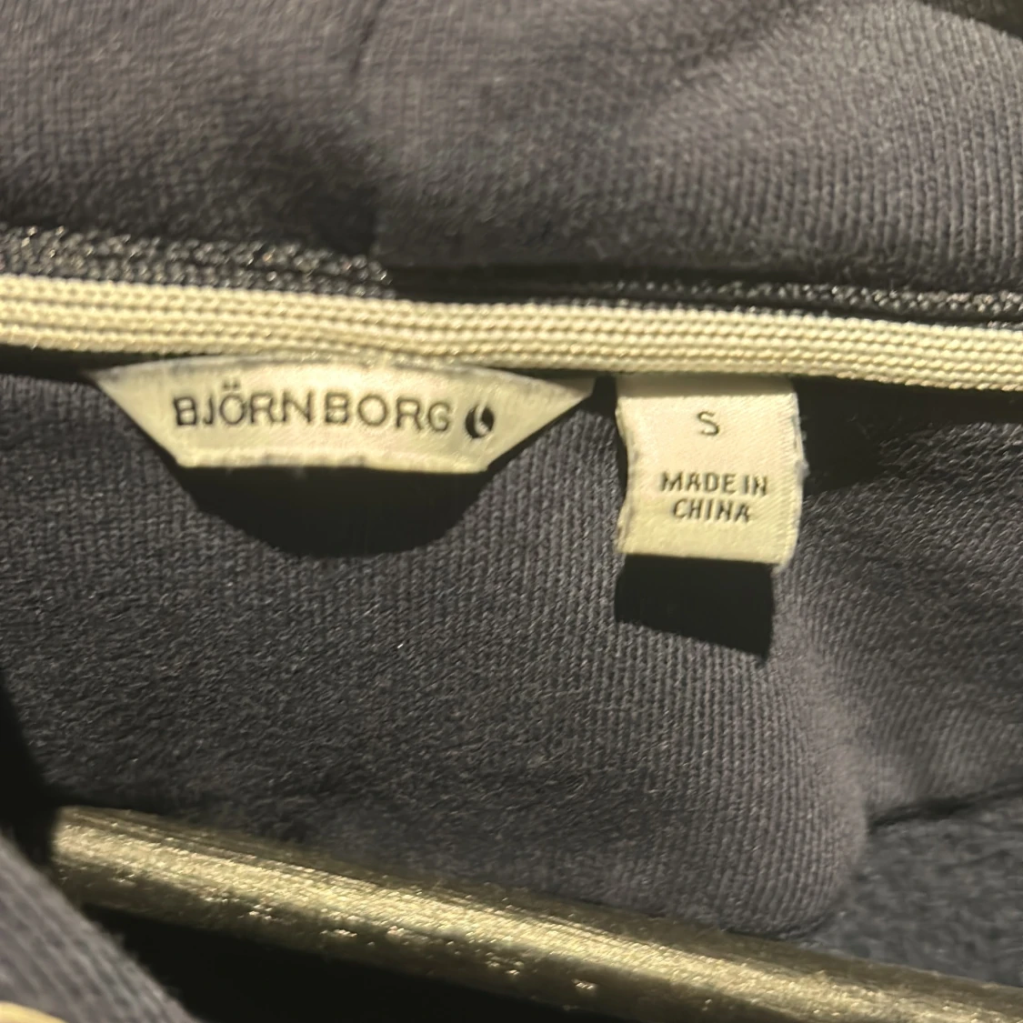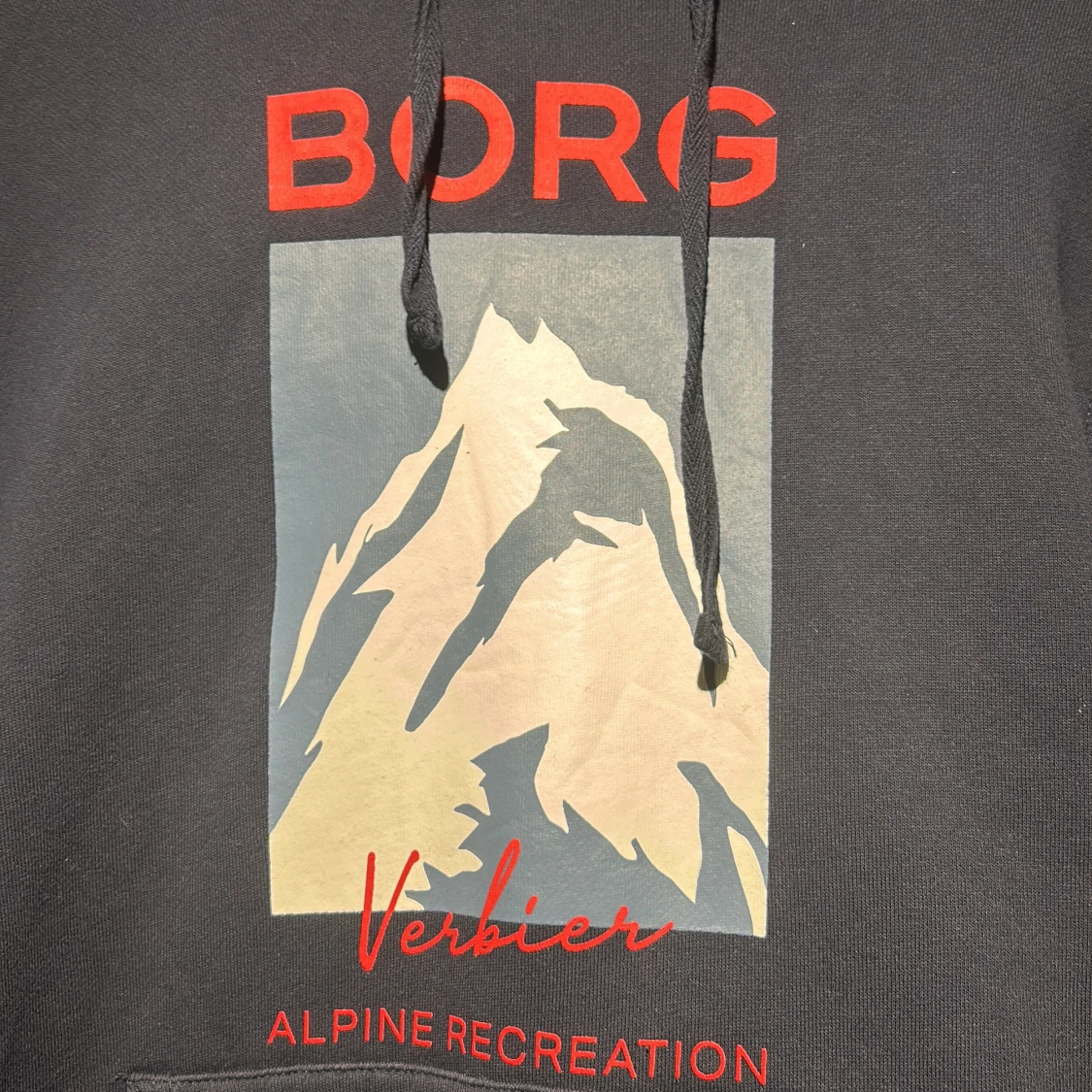 Säljer en mörkblå hoodie från Björn Borg med tryck av ett berg och texten 'Verbier Alpine Recreation' i rött. Tröjan har en klassisk känguruficka och justerbar huva med dragsko.