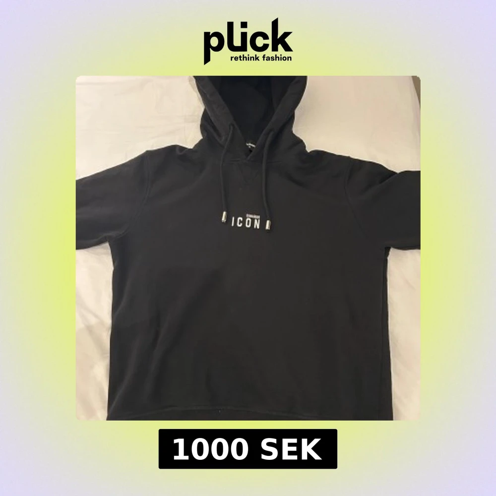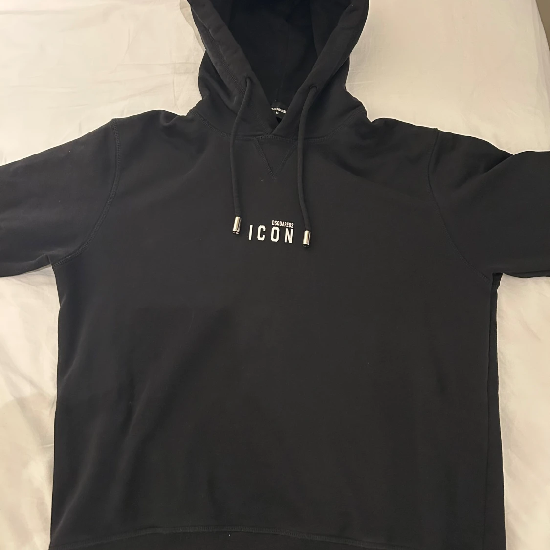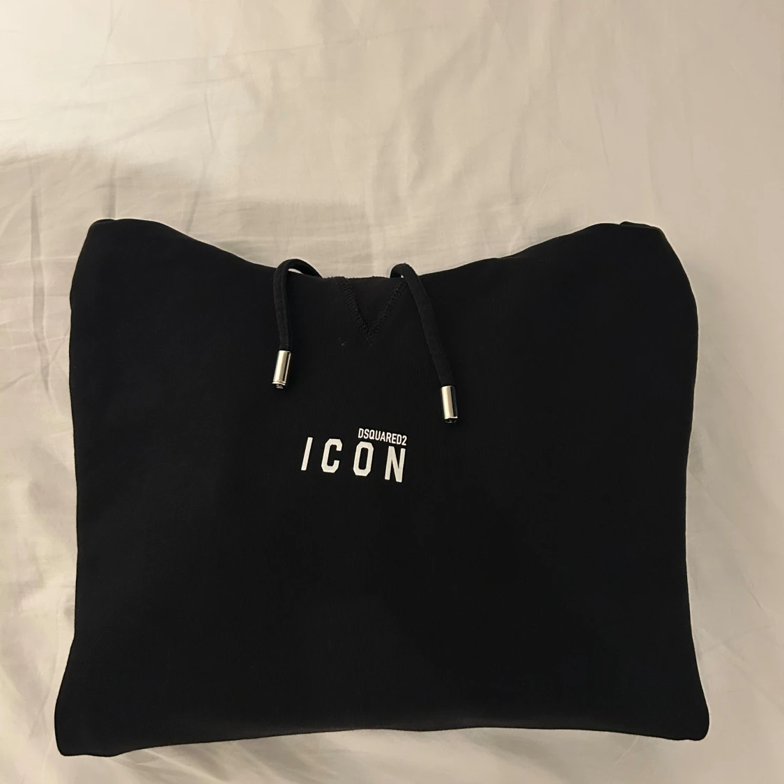 Svart hoodie från Dsquared2 med vit 'ICON'-text på bröstet. Klassisk huva med snörning och metalländar, samt långärmad design ( köpt på miinto för 1500:- )
