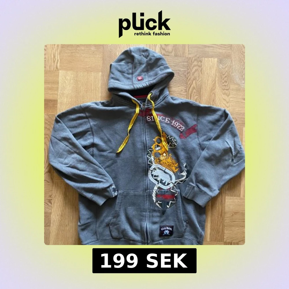 Säljer en grå hoodie från Ecko Unltd med dragkedja och färgglada broderade detaljer. Den har en stor huva och gula snören. Perfekt för en avslappnad stil. Skulle säga att den är lite stor/lös så passar perfekt till den som gillar lite baggy. 🩶