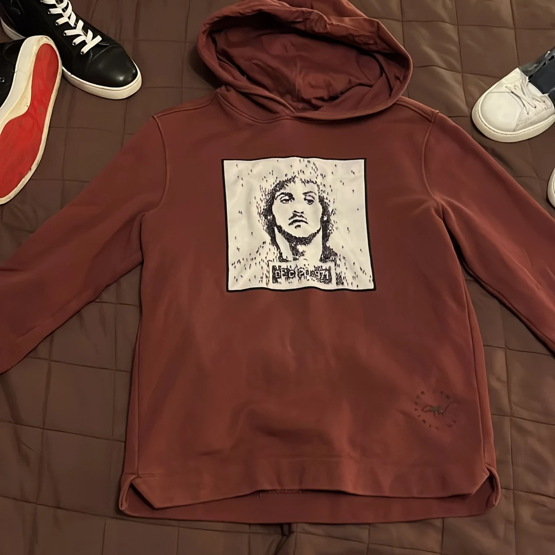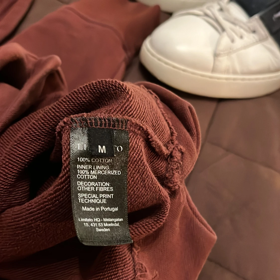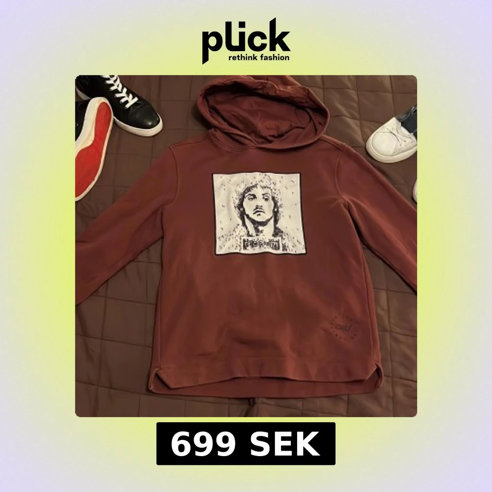 Säljer en vinröd hoodie från Limitato i 100% bomull. Den har en unik tryckdetalj på framsidan med en konstnärlig design. Perfekt för en avslappnad stil med en touch av konstnärlig flair. nypris ligger den på 2100
