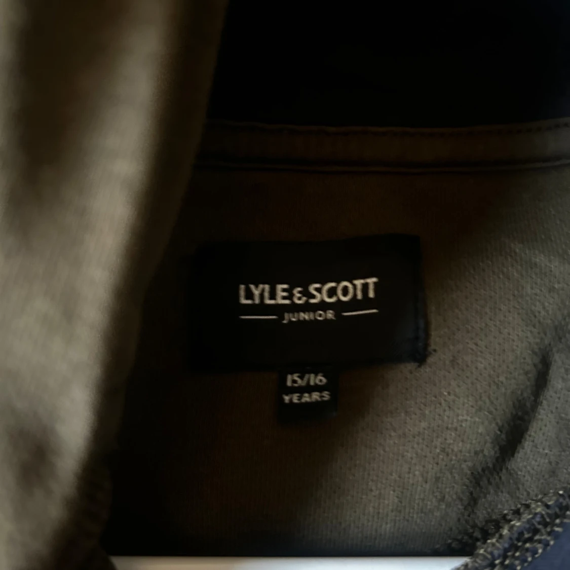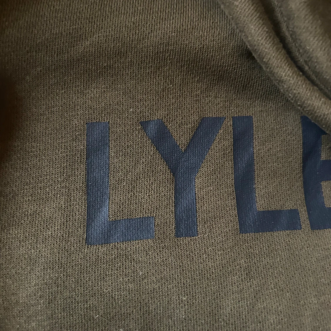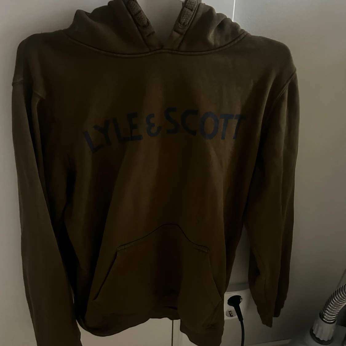 Säljer en olivgrön hoodie från Lyle & Scott Junior med stor logga i mörkblått framtill. Tröjan har huva, känguruficka och långa ärmar. Materialet är mjuk bomull och passformen är normal. Perfekt för chill dagar och streetwear.