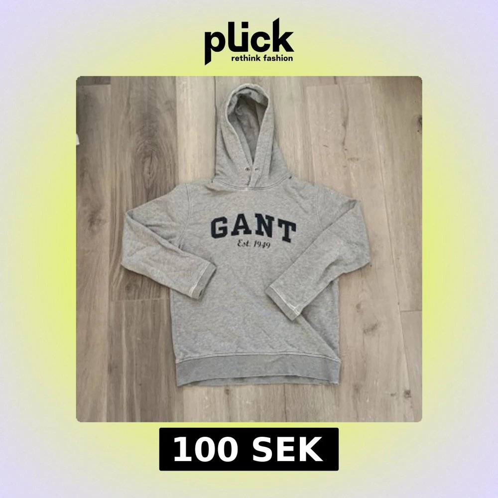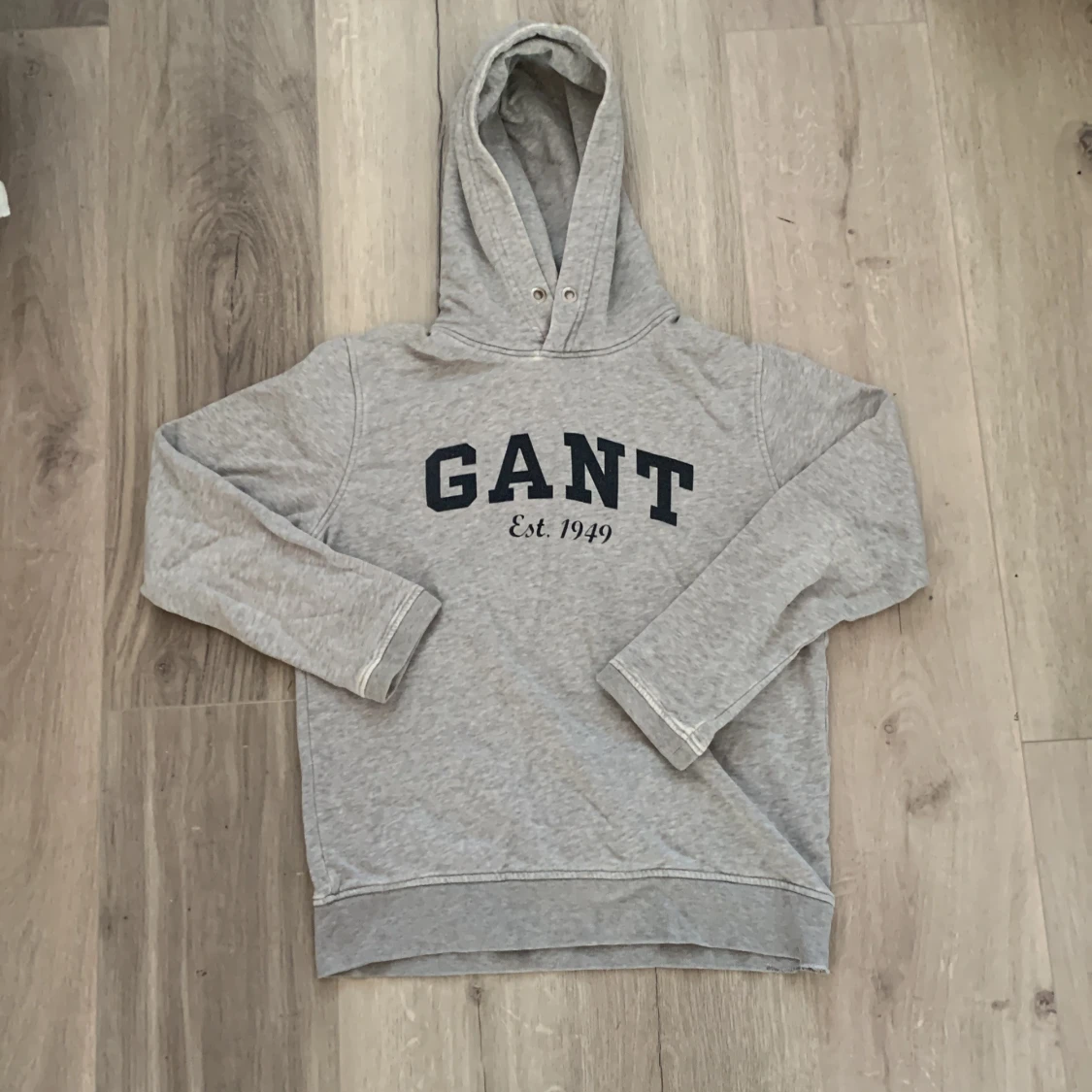 Säljer en klassisk grå hoodie från GANT med tryck framtill. *har en liten fläck på ärmen men syns inte när man har på den, barn size