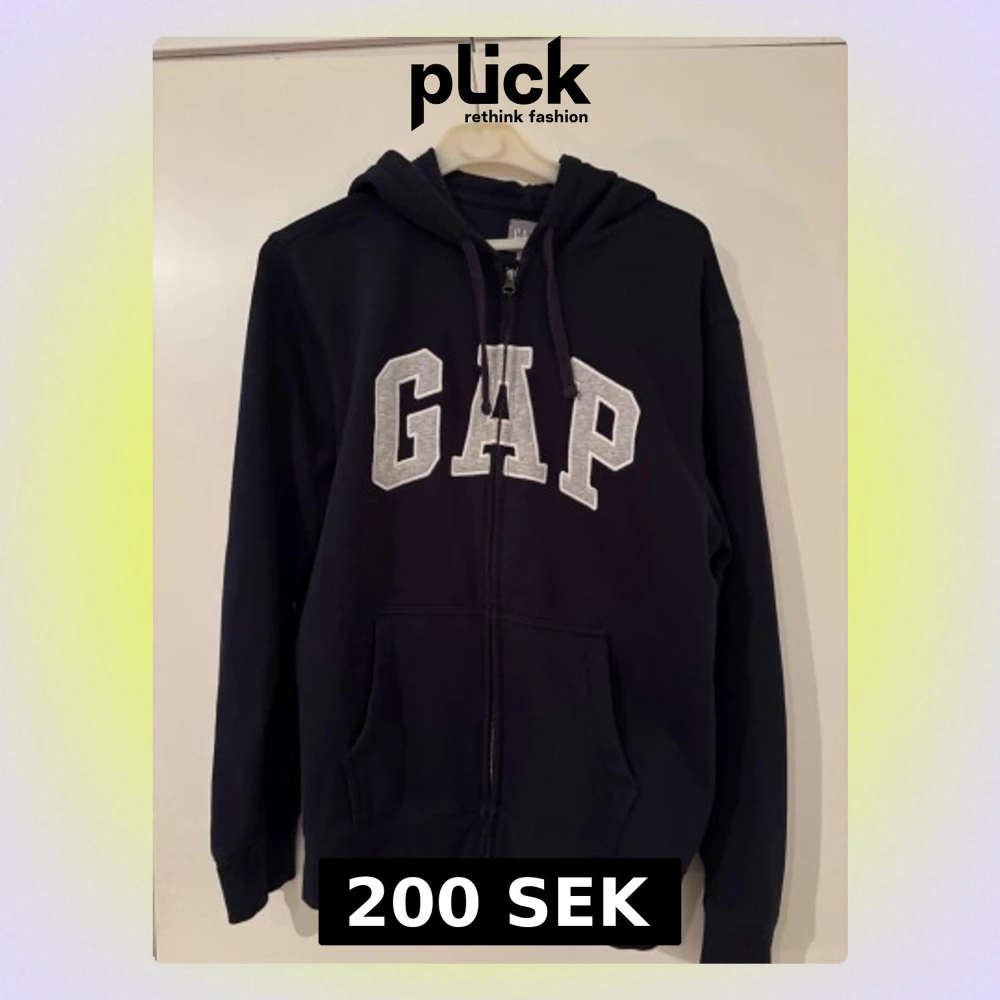Säljer en mörkblå hoodie från GAP i storlek L. Tröjan har vit GAP-logga framtill, huva med snörning och praktiska fickor. Materialet är mjuk bomull och den har lång ärm samt dragkedja hela vägen