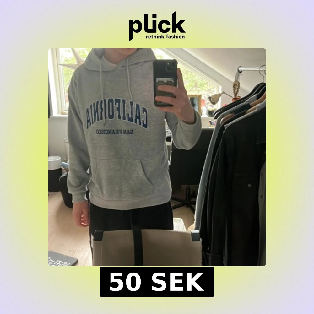 Säljer en grå hoodie med texten 'California San Francisco' i blått tryck. Tröjan har en klassisk känguruficka och justerbar huva med dragsko. Perfekt för en avslappnad stil. Aldrig använd