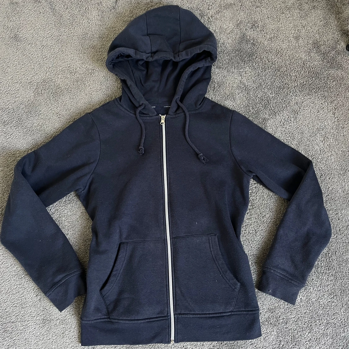 En klassisk mörkblå hoodie med dragkedja framtill och två fickor. Tröjan har huva med dragsko och långa ärmar. Perfekt för en avslappnad stil.
