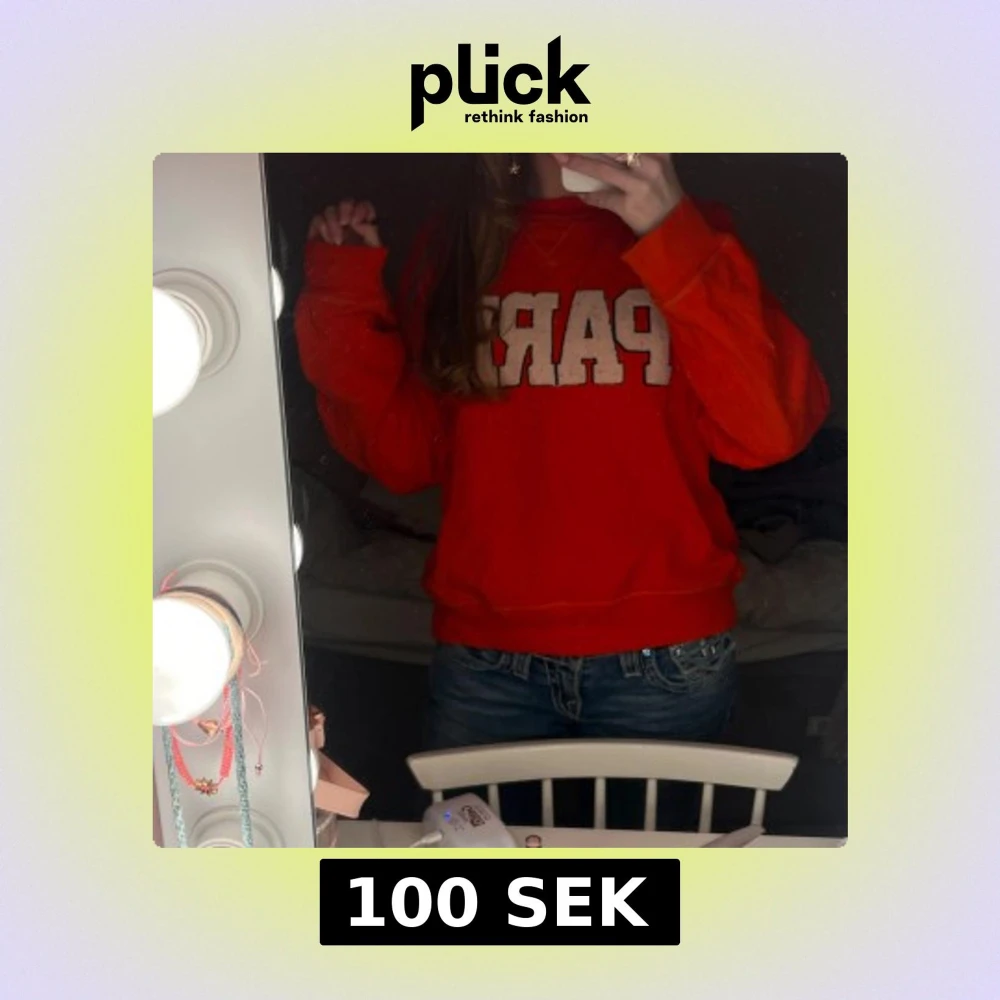 Säljer en cool röd sweatshirt med texten 'PARIS' i vitt på framsidan. Tröjan har en avslappnad passform och långa ärmar, perfekt för en casual look. Den är gjord i ett mjukt material som känns skönt mot huden.