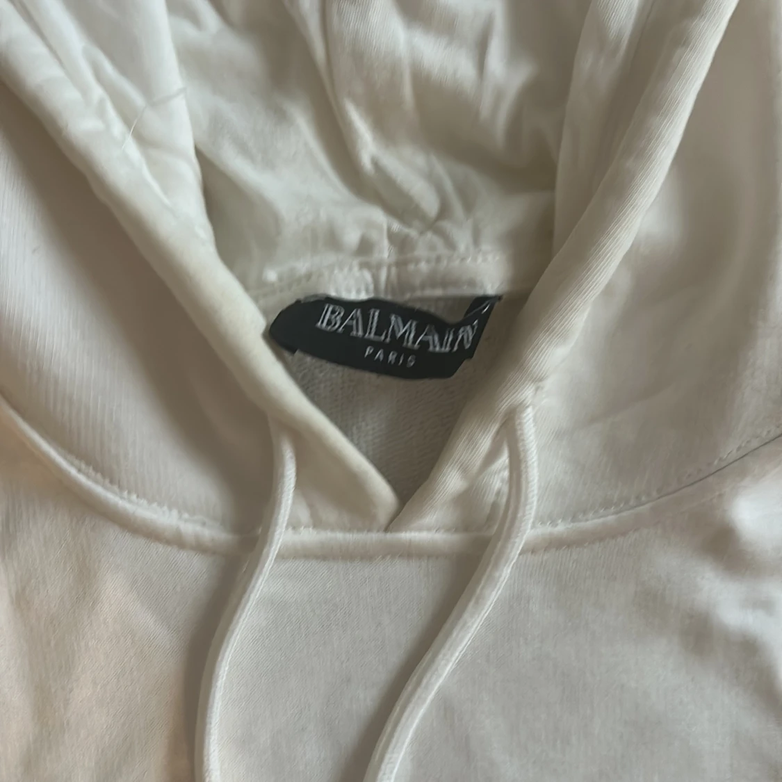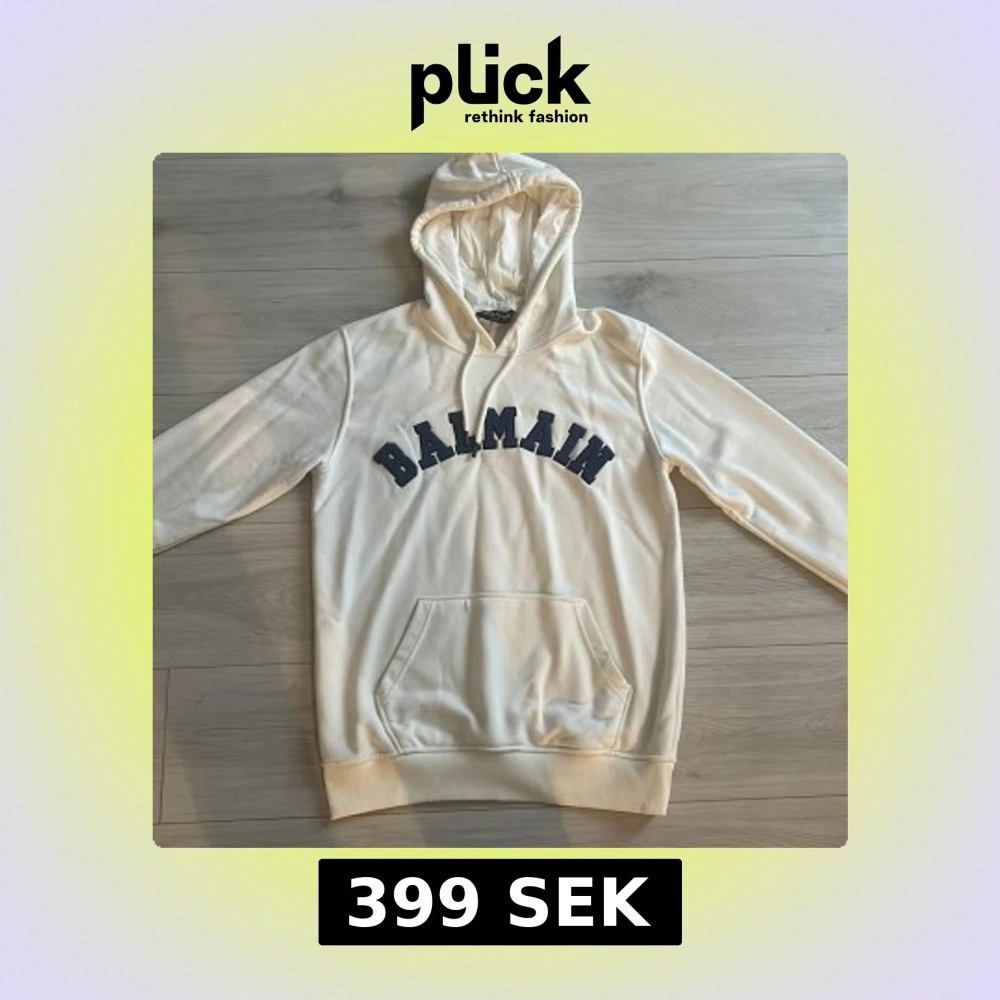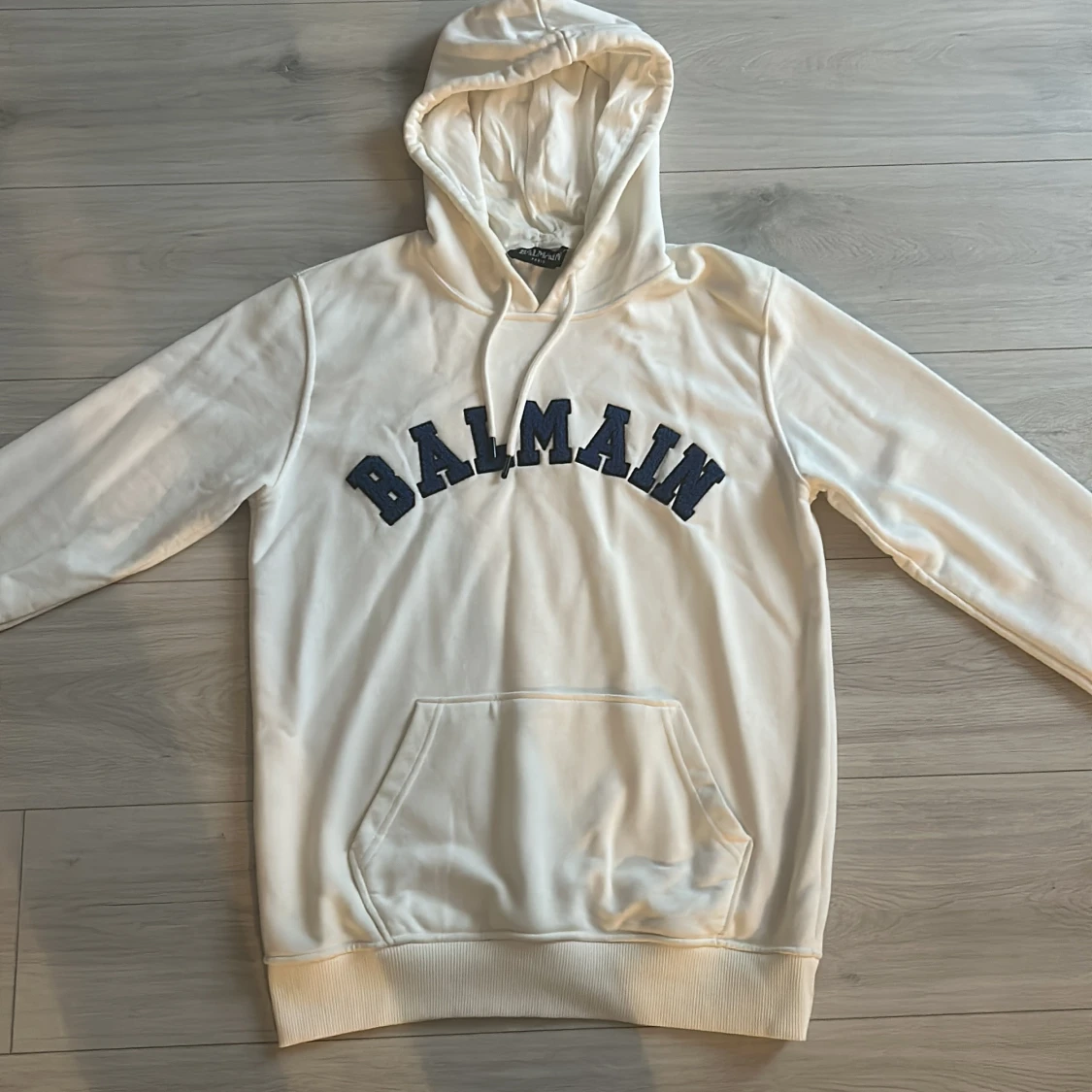 Säljer en stilren vit hoodie från Balmain med blå text på bröstet. Tröjan har en klassisk känguruficka och justerbar huva . Perfekt för en avslappnad look.