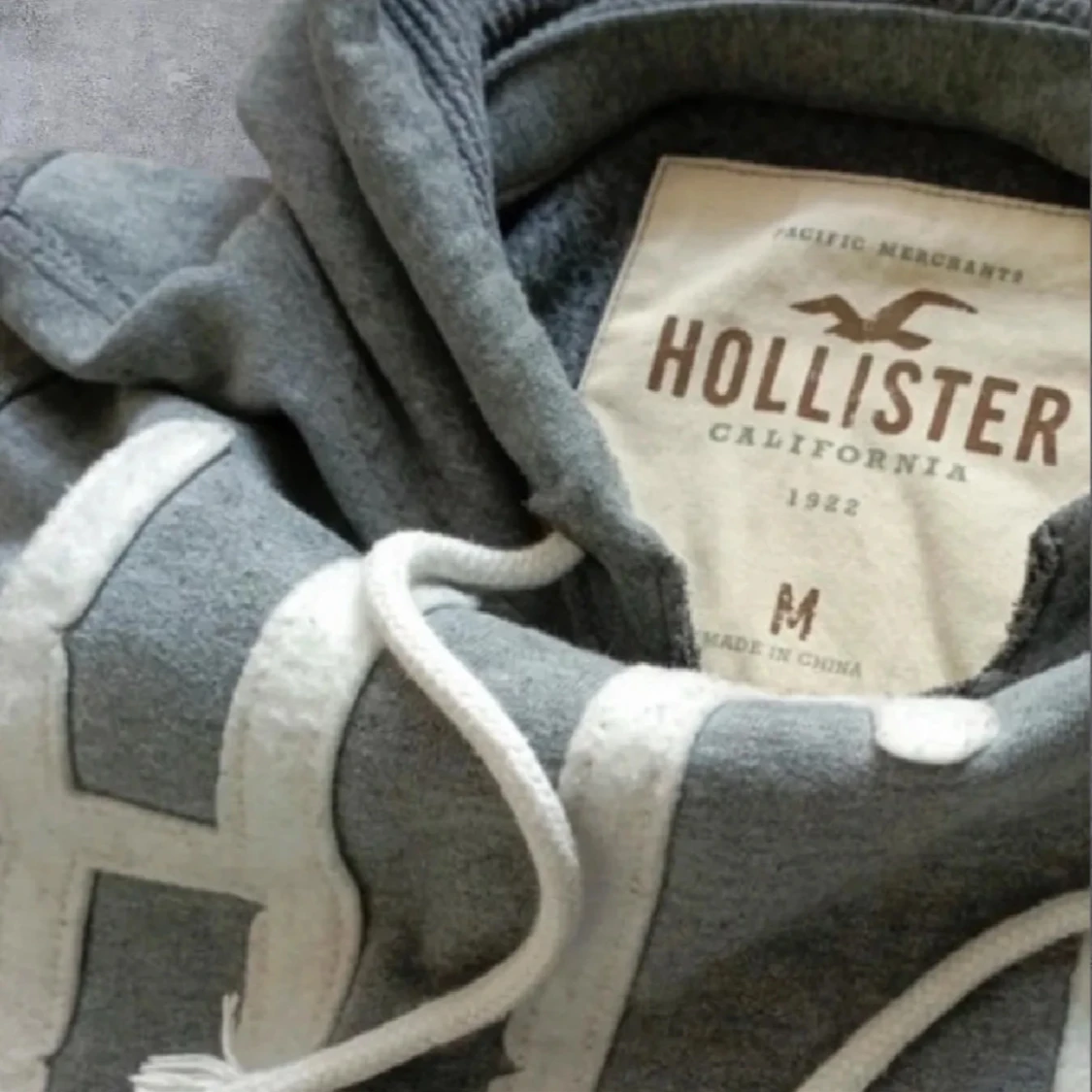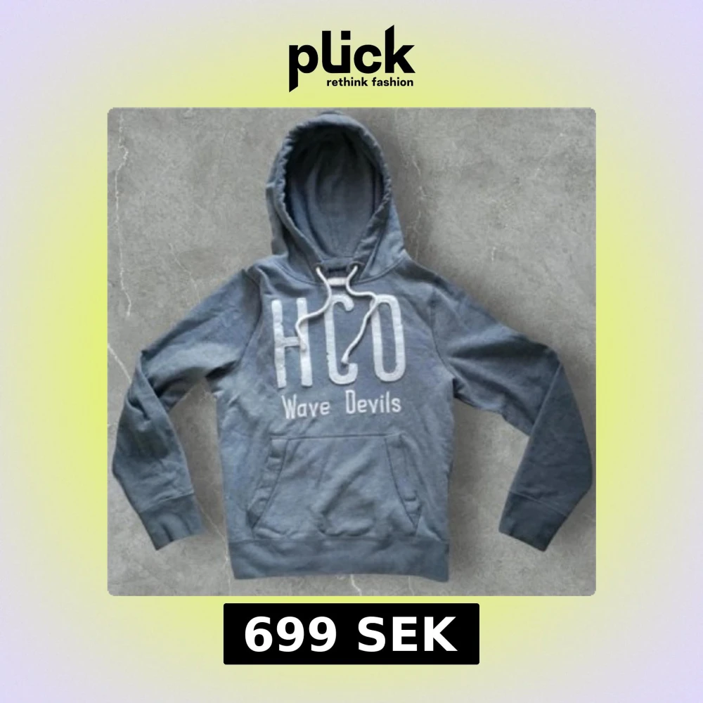 Säljer en grå hoodie från Hollister med stort vitt HCO-tryck och texten 'Wave Devils' på bröstet. Tröjan har huva med snörning och en klassisk känguruficka framtill. Perfekt för chill dagar och snygg streetstil.