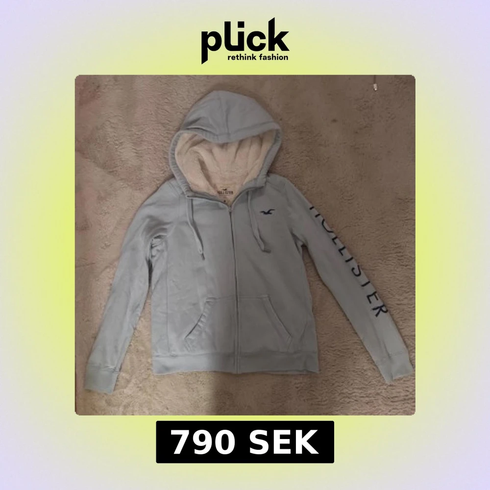 Mysig ljusblå hoodie från Hollister med fluffigt foder i luvan och insidan. Tröjan har dragkedja, snörning i huvan, fickor fram och Hollister-logga på bröstet samt tryck längs ena ärmen. Perfekt för kyliga dagar.