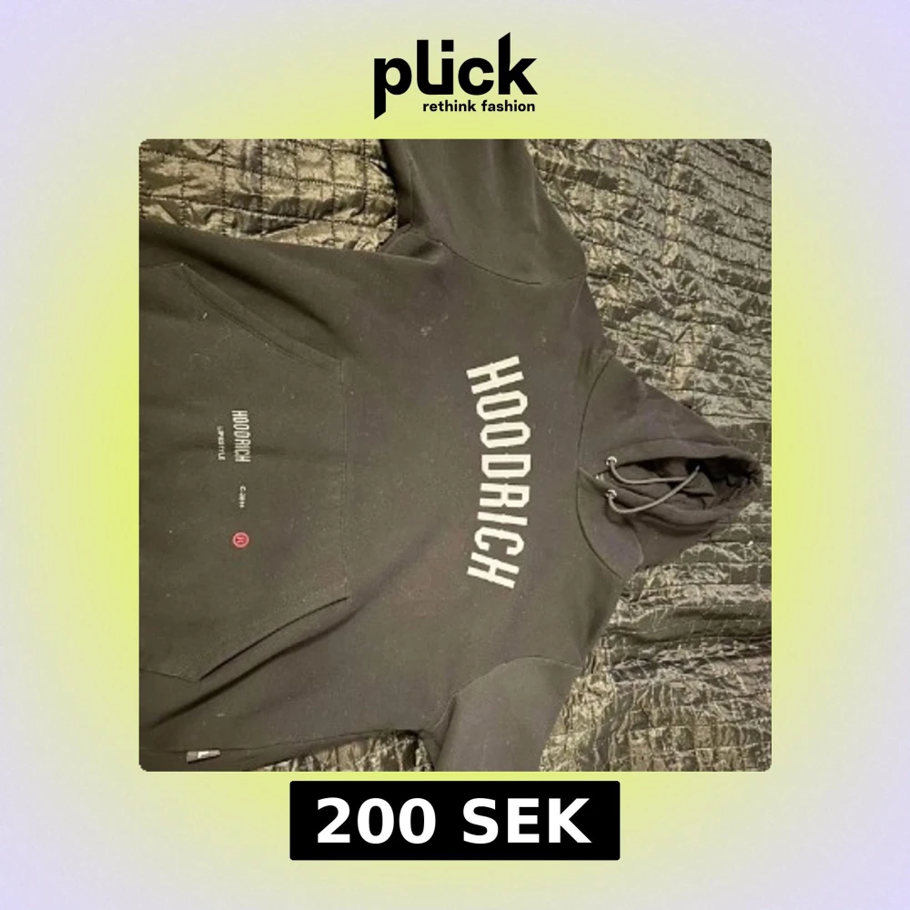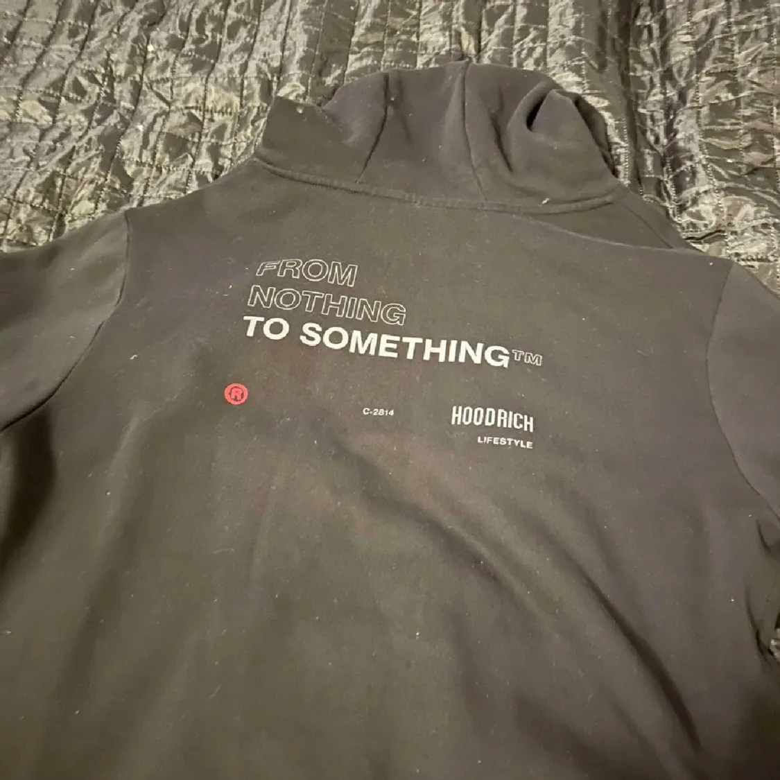 Säljer en svart hoodie från Hoodrich med texten 'HOODRICH' på framsidan och 'FROM NOTHING TO SOMETHING' på baksidan. Hoodien har en stor ficka framtill och justerbar huva med snören. Perfekt för en avslappnad stil.