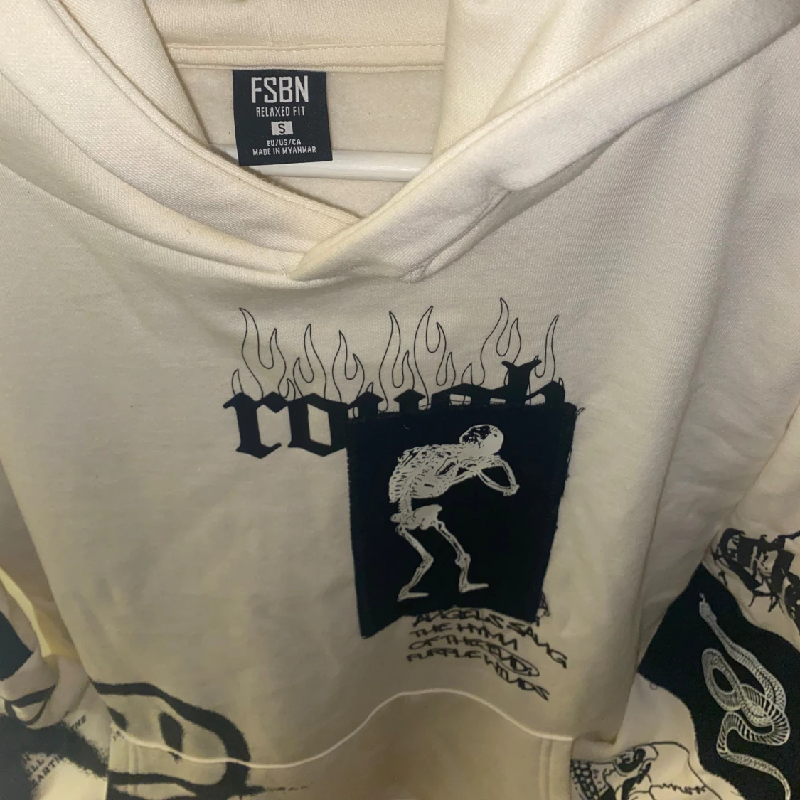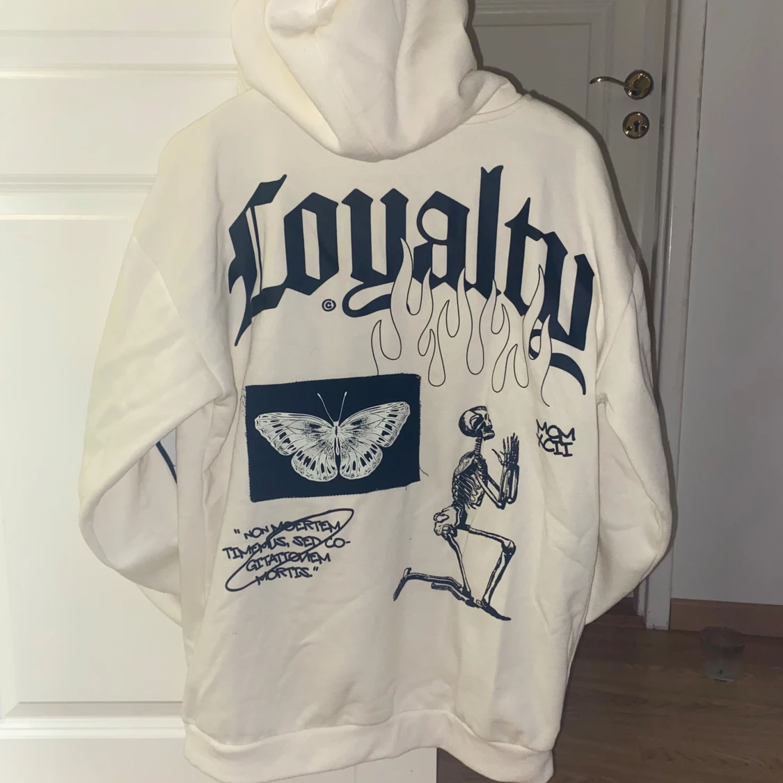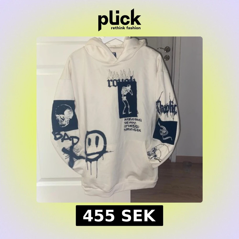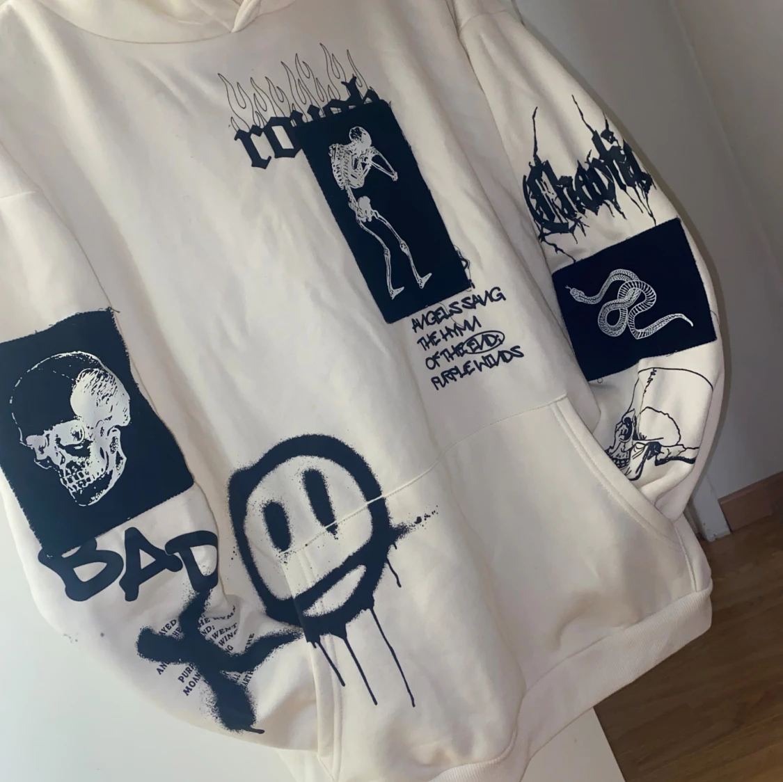 Säljer denna feta beige hoodien med svart tryck av bilder och text på framsidan, baksidan o längst armarna. Den har inte kommit till användning bara legat i garderoben ett tag nu så väldigt fint skick