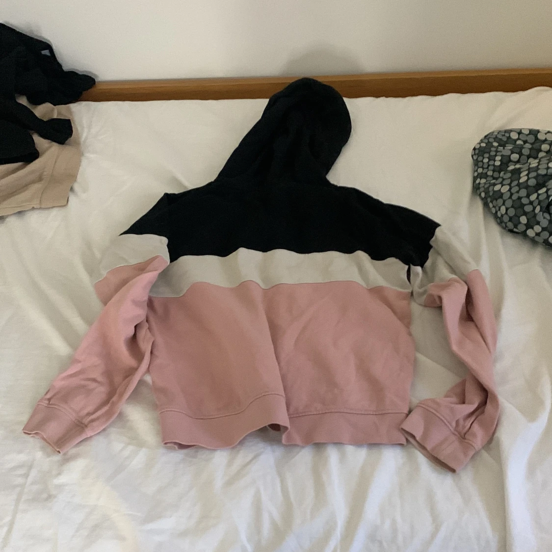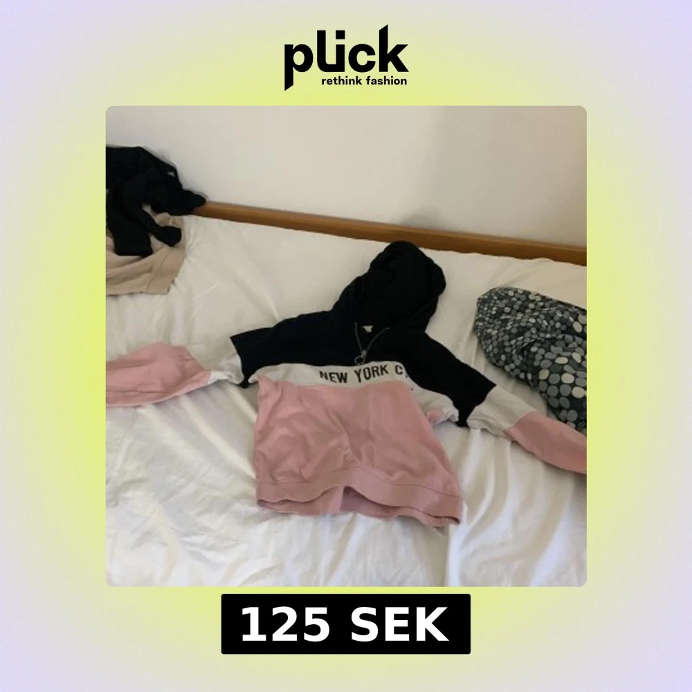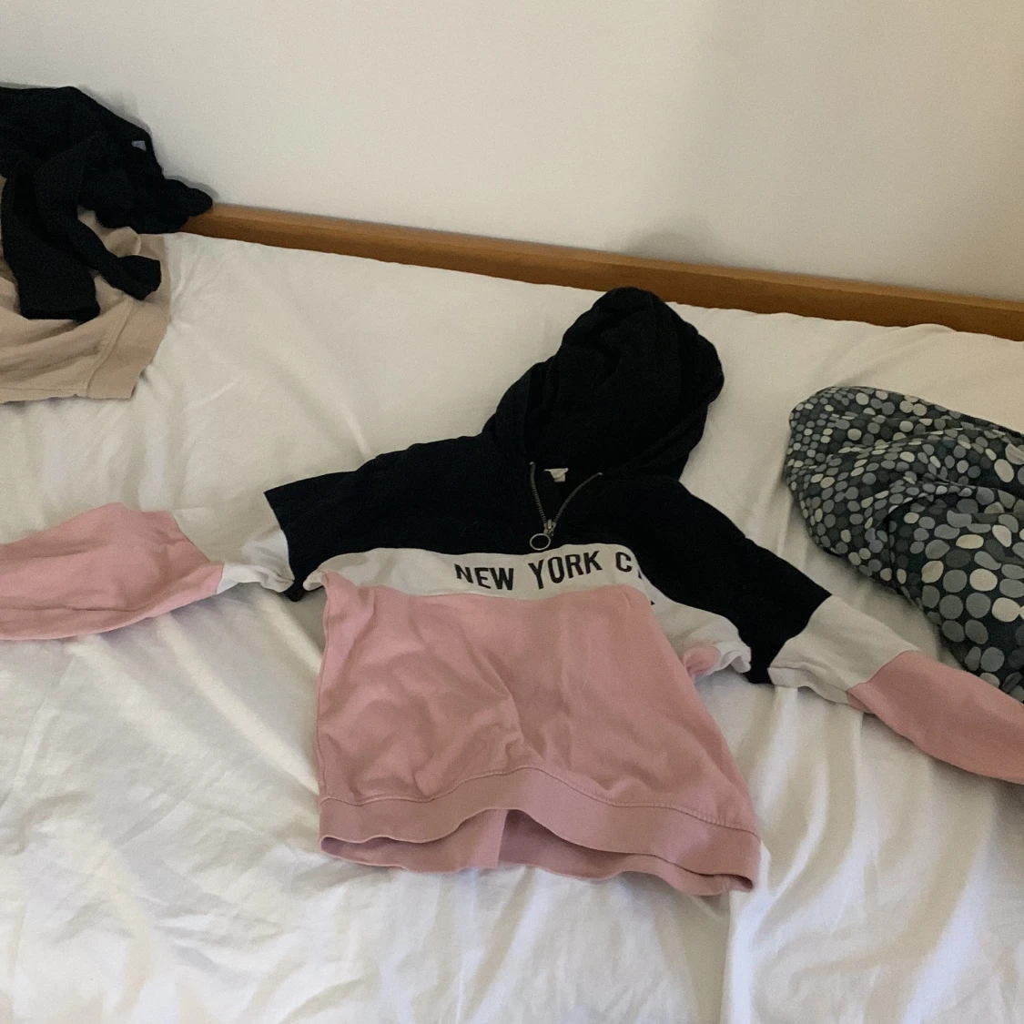 Snygg hoodie i blockfärger med svart huva och överdel, vit mittsektion och ljusrosa nederdel samt ärmar. Framsidan har texten 'New York City' och en halv dragkedja vid halsen. Perfekt för en chill och trendig look.
