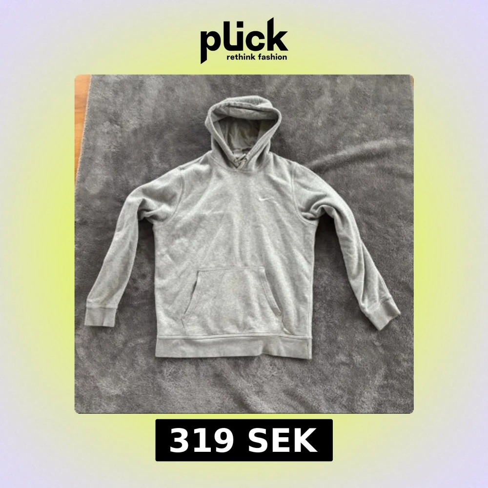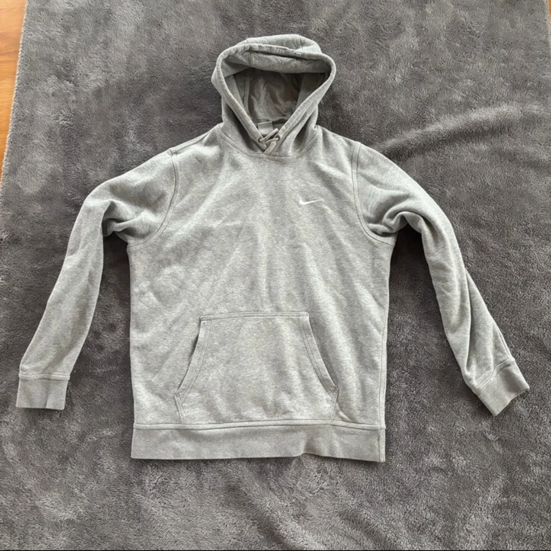 Säljer en klassisk grå hoodie från Nike i storlek L. Tröjan har huva med snörning, magficka och diskret Nike-logga på bröstet. Tillverkad i mjuk bomullsblandning med 80% bomull och 20% polyester för extra komfort. Perfekt för chill dagar eller när du vill ha en enkel streetstyle.