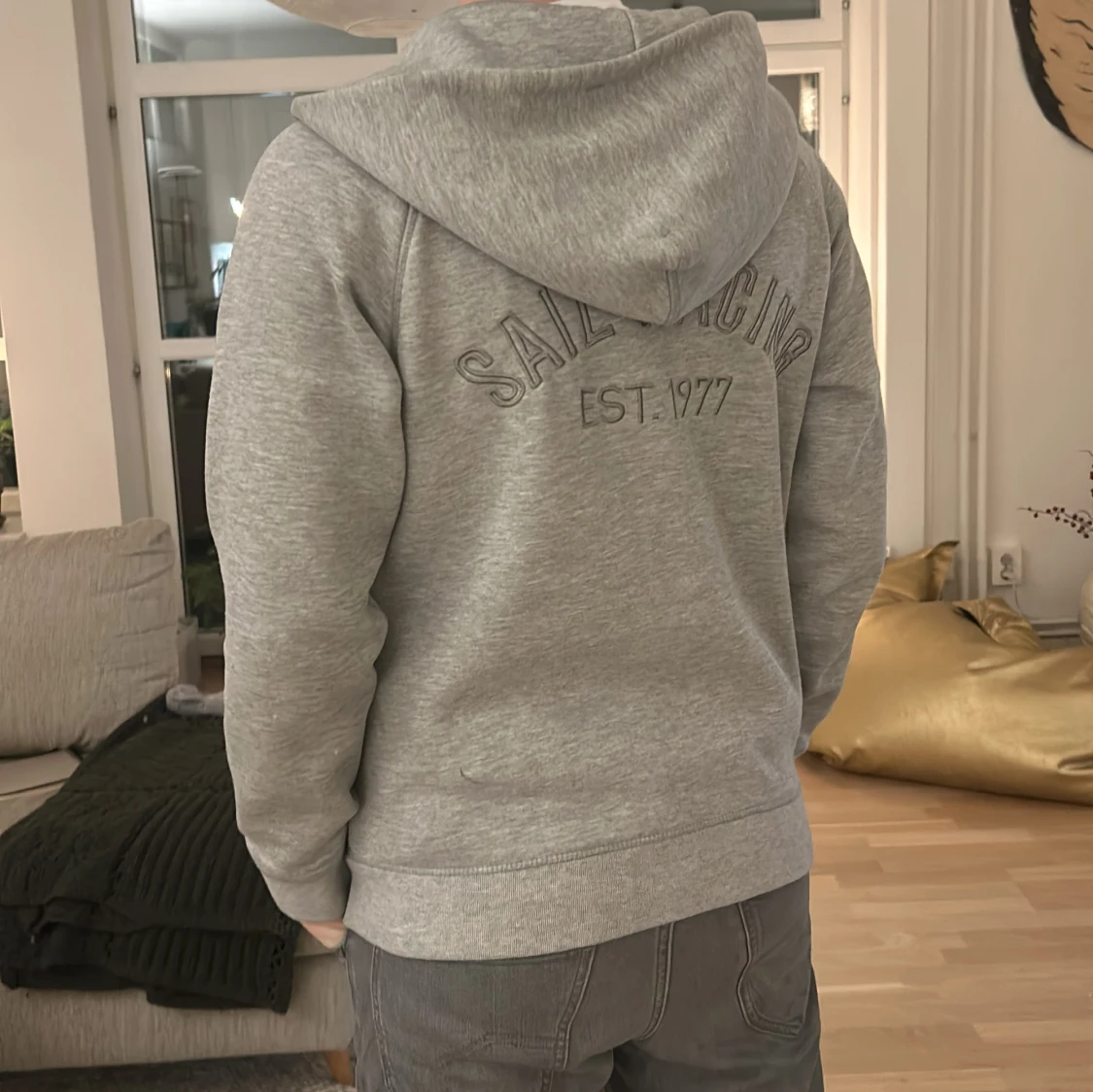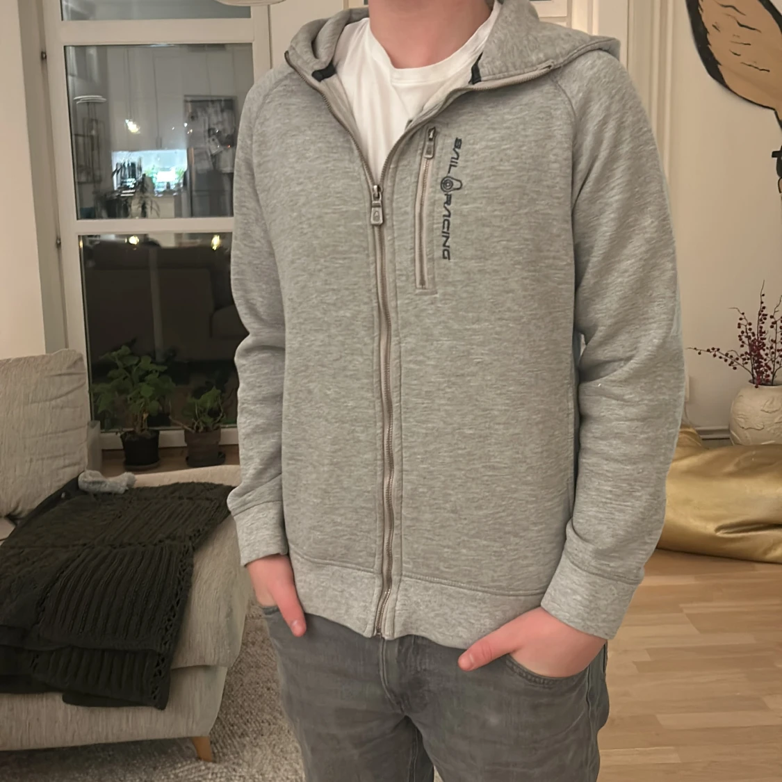 Storlek M passar S, Säljer en grå hoodie från Sail Racing med dragkedja och tryck på bröstet och ryggen. Tröjan har en bekväm passform och är perfekt för kyligare dagar. Den har ribbade muddar vid ärmslut och nederkant.