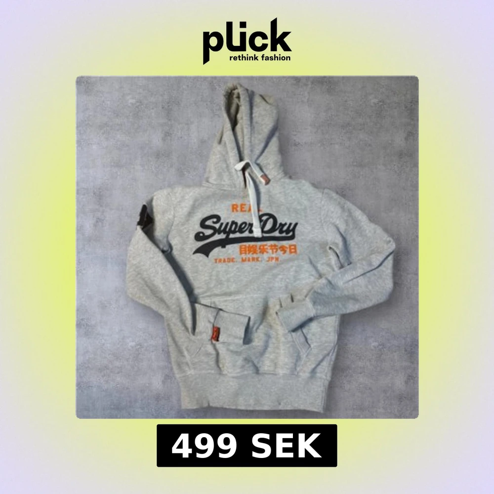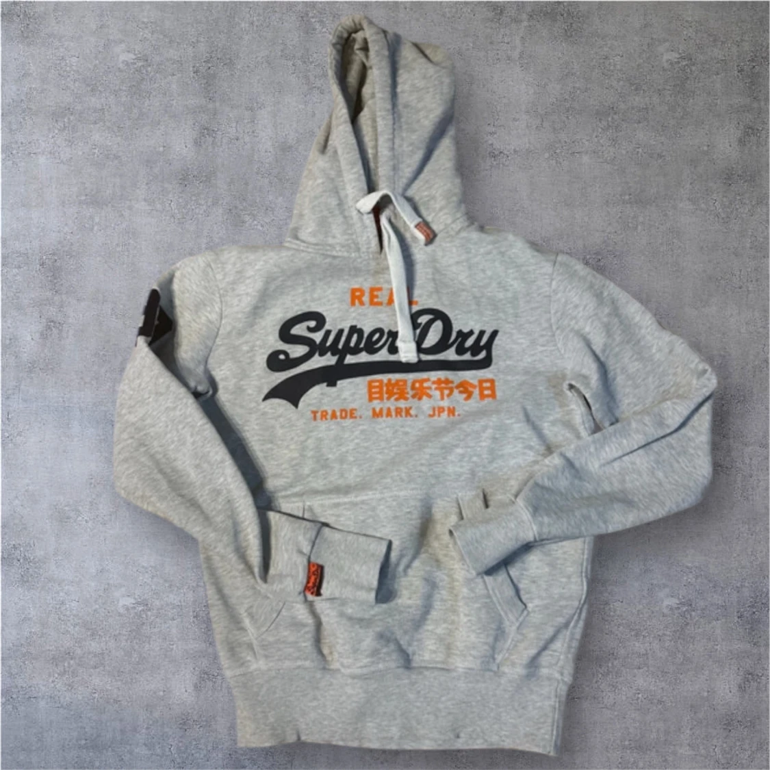 Snygg grå hoodie från Superdry med stort svart och orange tryck på bröstet och japanska tecken. Tröjan har huva med snörning, magficka och ribbade muddar. Perfekt för chill dagar och streetstyle. Tillverkad i mjuk bomullsmix.