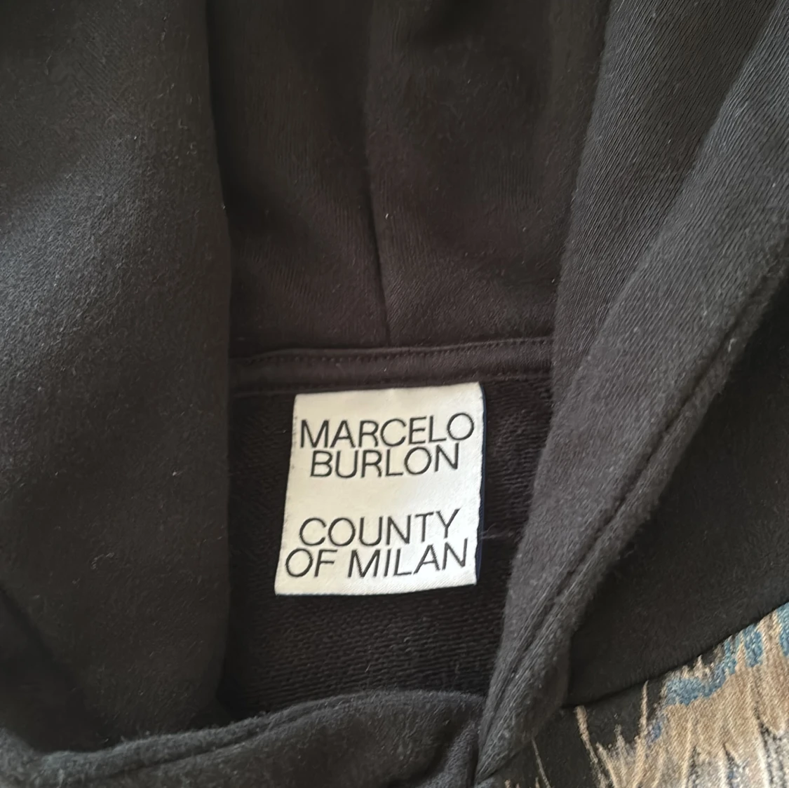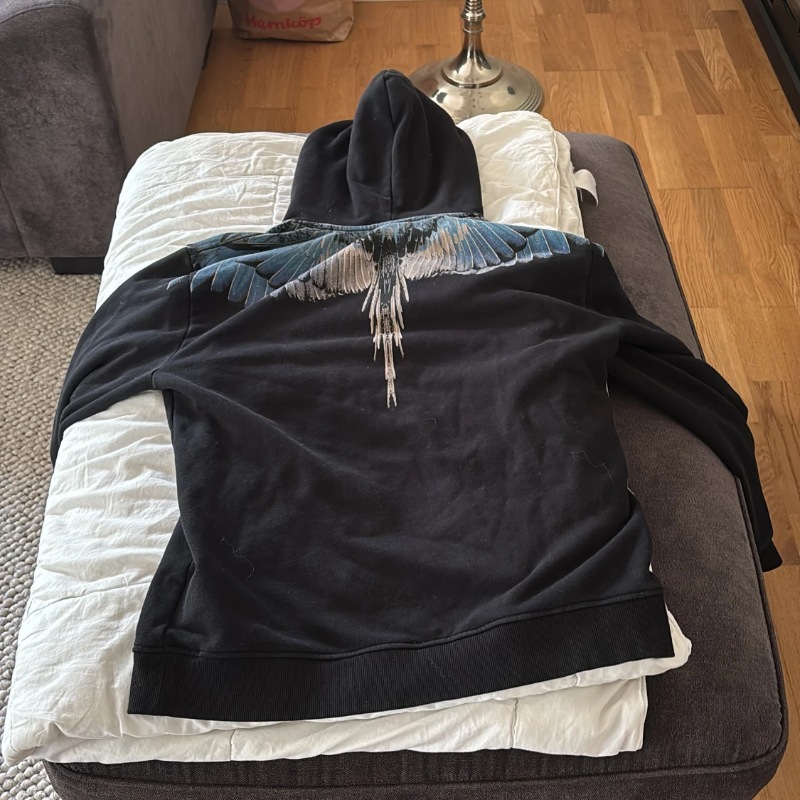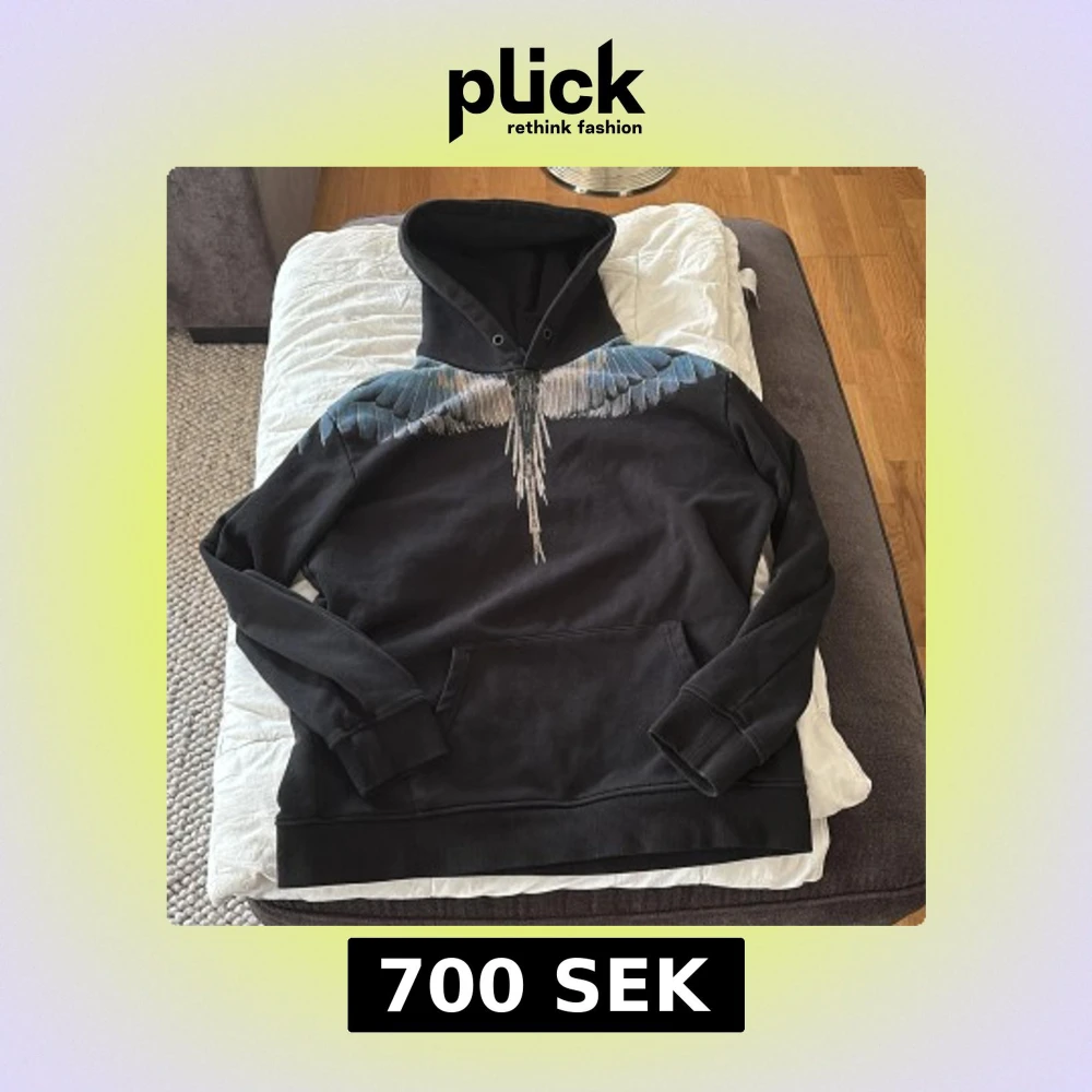 Säljer en svart hoodie från Marcelo Burlon med ett coolt vingmönster i blått och vitt över axlarna. Tröjan har en klassisk passform med långa ärmar och en stor ficka framtill. Perfekt för en stilren och avslappnad look.