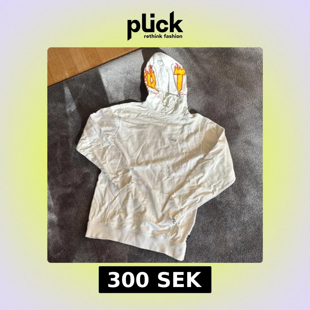 Säljer en vit hoodie från Vans med ett coolt Thrasher-tryck i gult och rött på huvan. Tröjan har en klassisk passform med långa ärmar och en stor ficka framtill. Perfekt för streetwear-stilen!