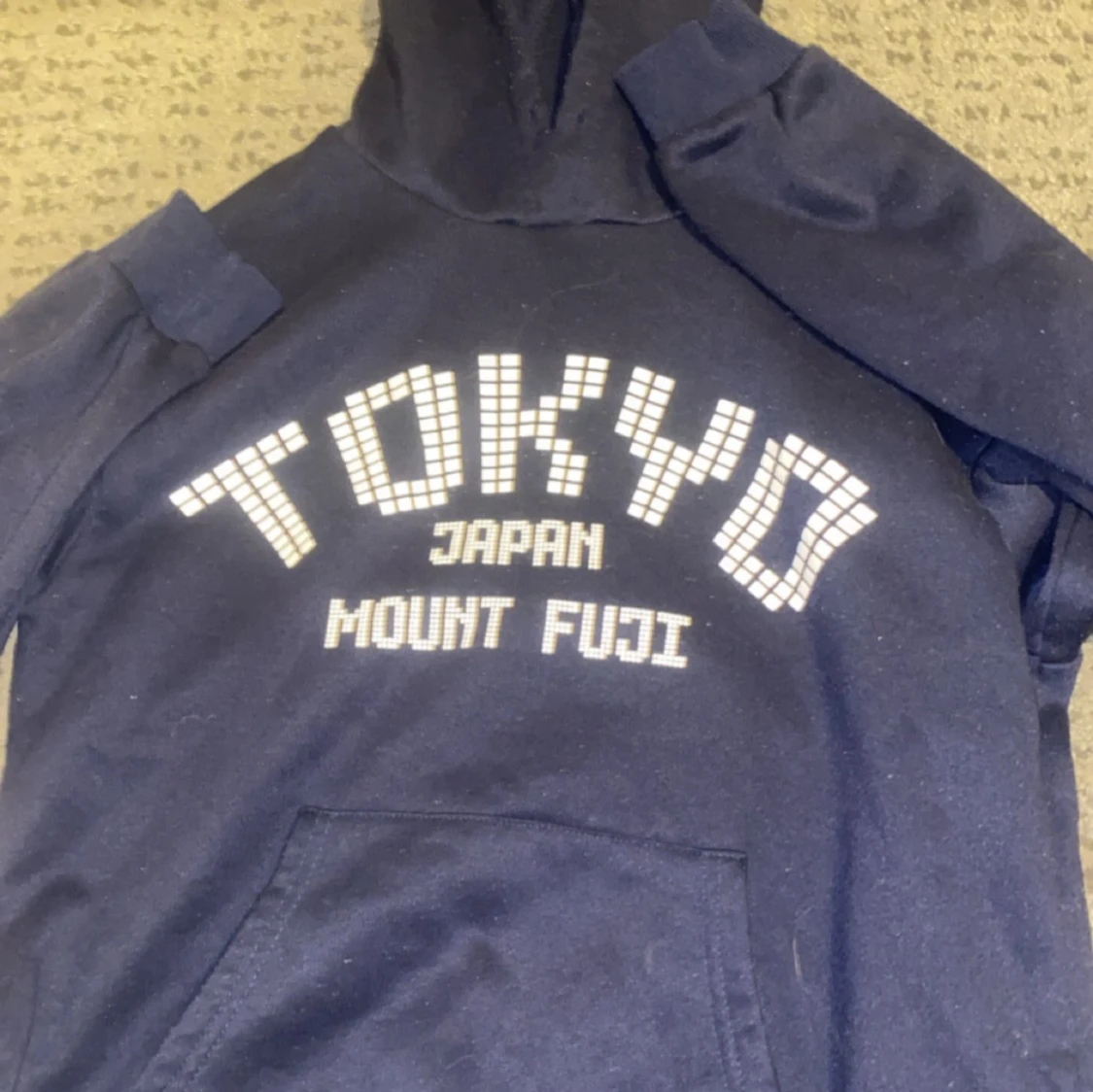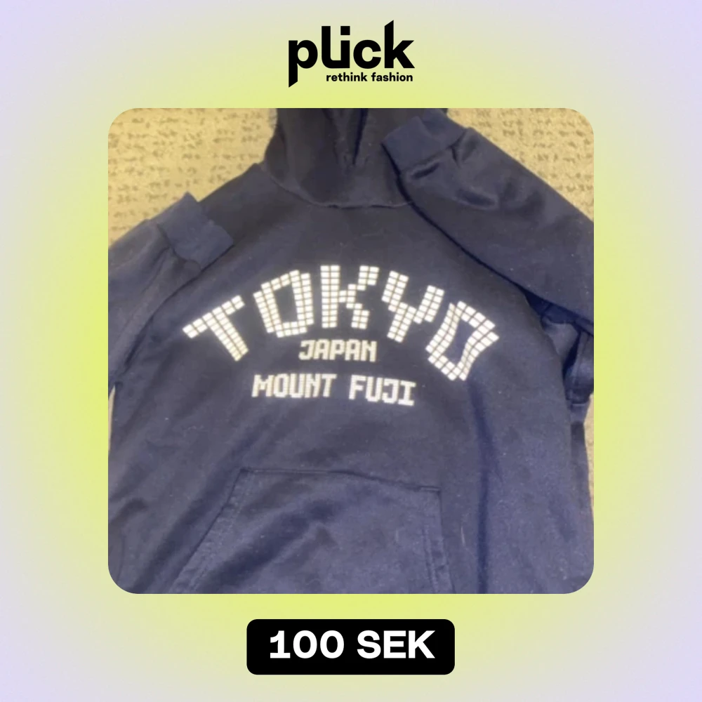 Säljer en snygg mörkblå hoodie med texten 'Tokyo Japan Mount Fuji' i vitt på framsidan. Perfekt för en avslappnad stil och håller dig varm under kyliga dagar. Den har en klassisk passform med en bekväm huva och känguruficka framtill.