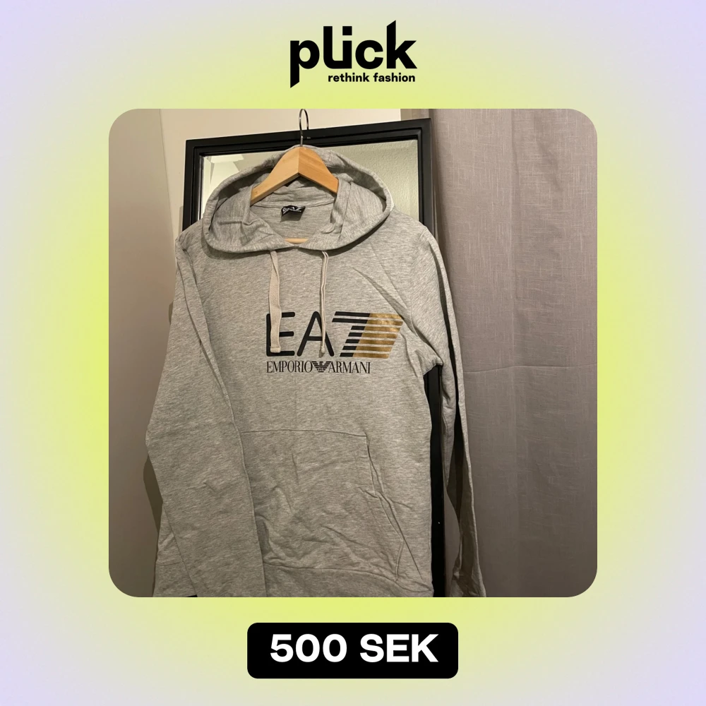 Säljer en snygg grå hoodie från Emporio Armani i storlek S passar även M, med deras ikoniska logga i svart och guld på bröstet. Den är i bomull och har en bekväm passform med långa ärmar och en praktisk huva med dragsko. Perfekt för både vardag och chill.
